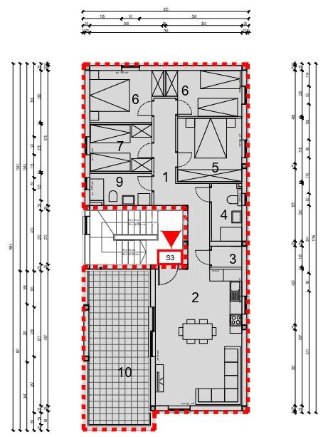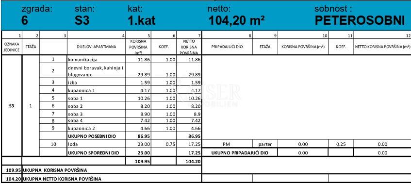 The apartment, marked S3 in building 6, is located on the first floor and offers a total net usable area of 104.20 m² (including the living area and outdoor areas according to coefficients). The interior living space of 86.95 m² is extremely spacious and cleverly arranged, providing maximum comfort for a large family or group of friends.