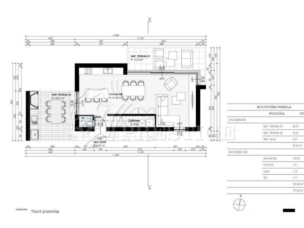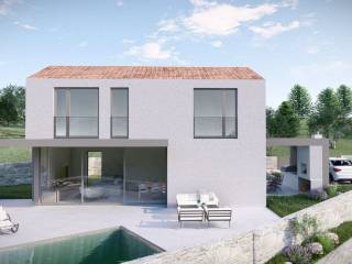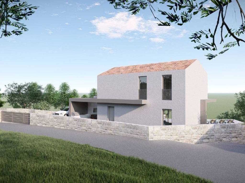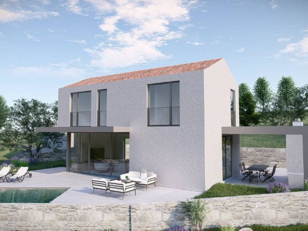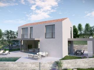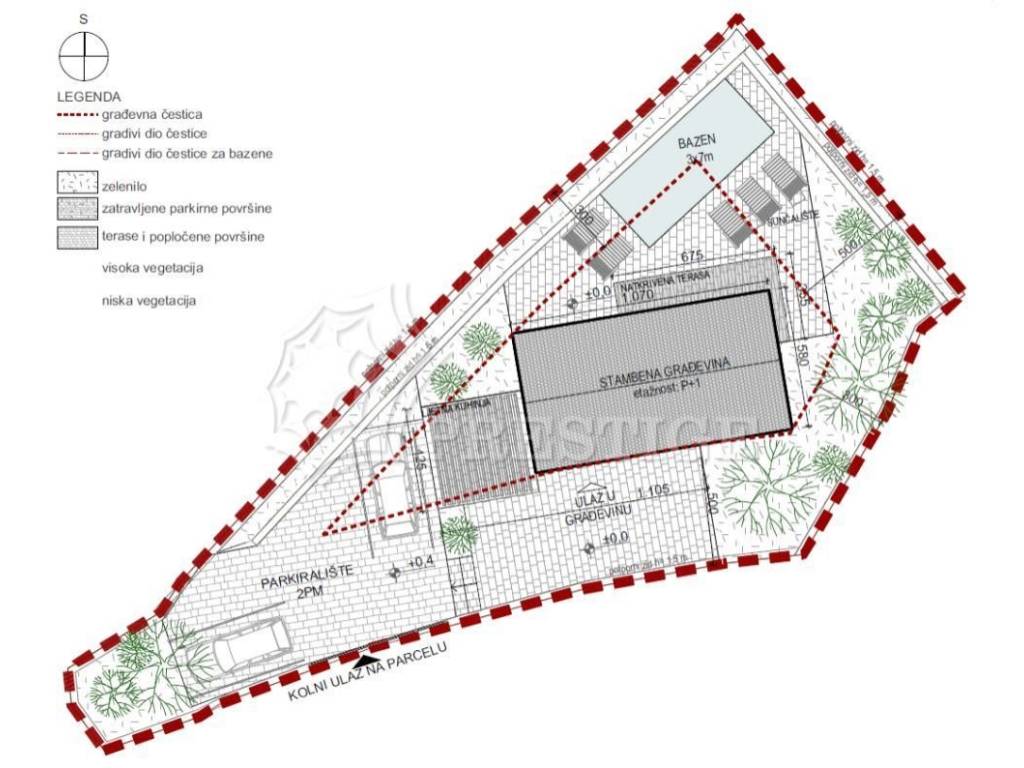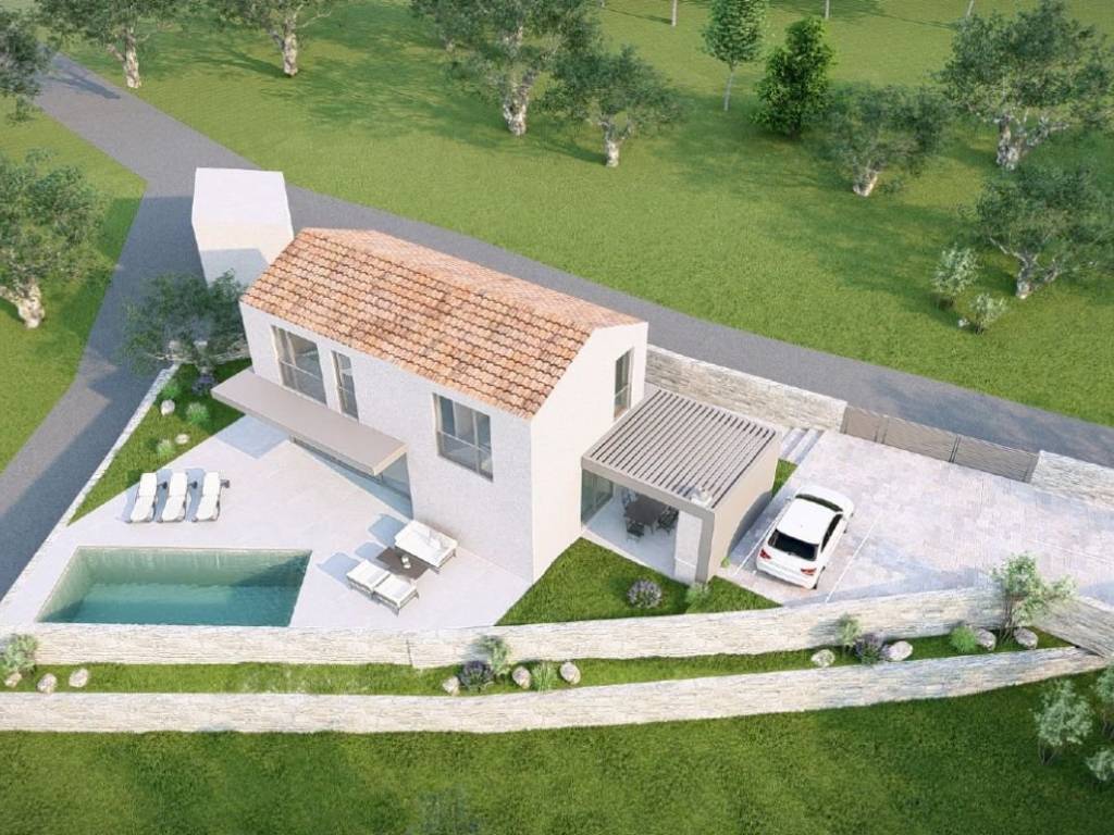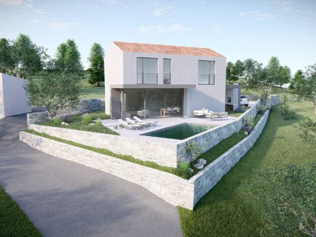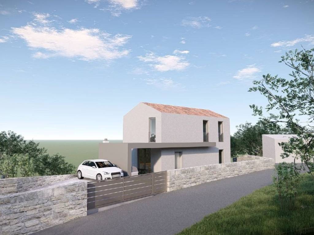 Otok Krk, Uvala Soline, šire područje, prodaja građevinskog zemljišta površine 450 m2, s pravomoćnom građevinskom dozvolom za izgradnju samostojeće vile s bazenom - prizemlje i prvi kat. Vila se sastoji od prizemlja 48 m2 s dnevnom sobom, kuhinjom, blagovaonom, toaletom, ostavom i dvije natkrivene terase, te prvog kata 50 m2 s dvije spavaće sobe s garderobom i kupaonicom. Pristupni put, priključak vode i struje. Mirna lokacija, 2000 m od mora.