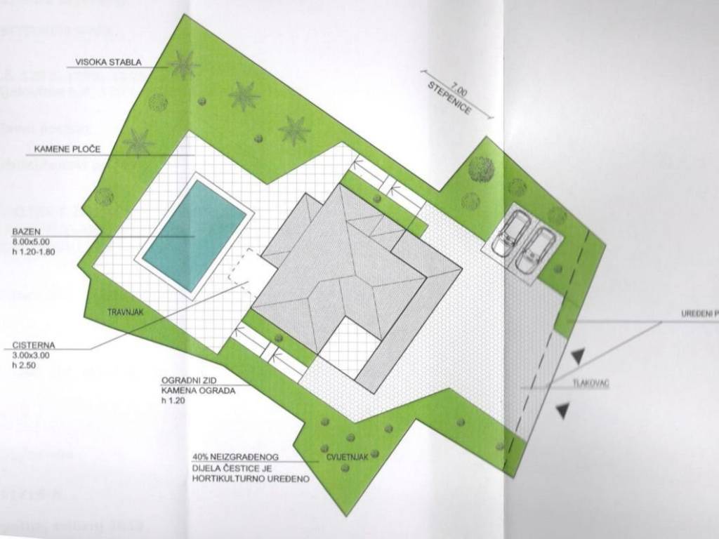 Lovran, prodaja atraktivnog građevinskog zemljišta površine 948 m2, s ishodovanom građevinskom dozvolom i projektom za izgradnju obiteljske vile s bazenom i otvorenim pogledom na more. Vila se sastoji od prizemlja, prvog i drugog kata. Mirna lokacija, 1500 m od mora.