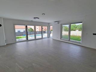 Otok Krk, Malinska, prodaja nove dvojne kuće površine 160 m2, s bazenom i pogledom na more. Kuća se sastoji od prizemlja s dnevnom sobom, kuhinjom, blagovaonom, kupaonicom, hodnikom i terasom, te prvog kata s tri spavaće sobe s vlastitim kupaonicama, garderobom, hodnikom i dva balkona. Kvalitetna gradnja i oprema, PVC stolarija s električnim roletama, klimatizacija, podno grijanje, dva parkirna mjesta. Mirna lokacija, 1000 m od mora.