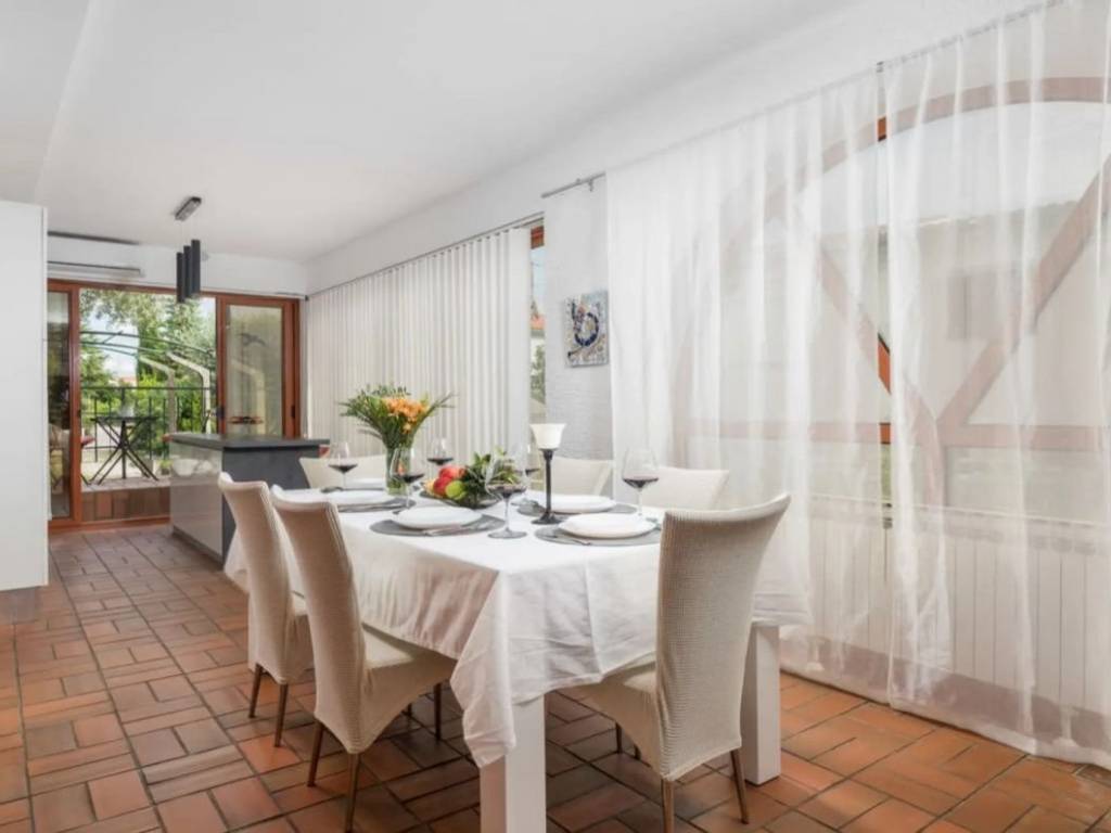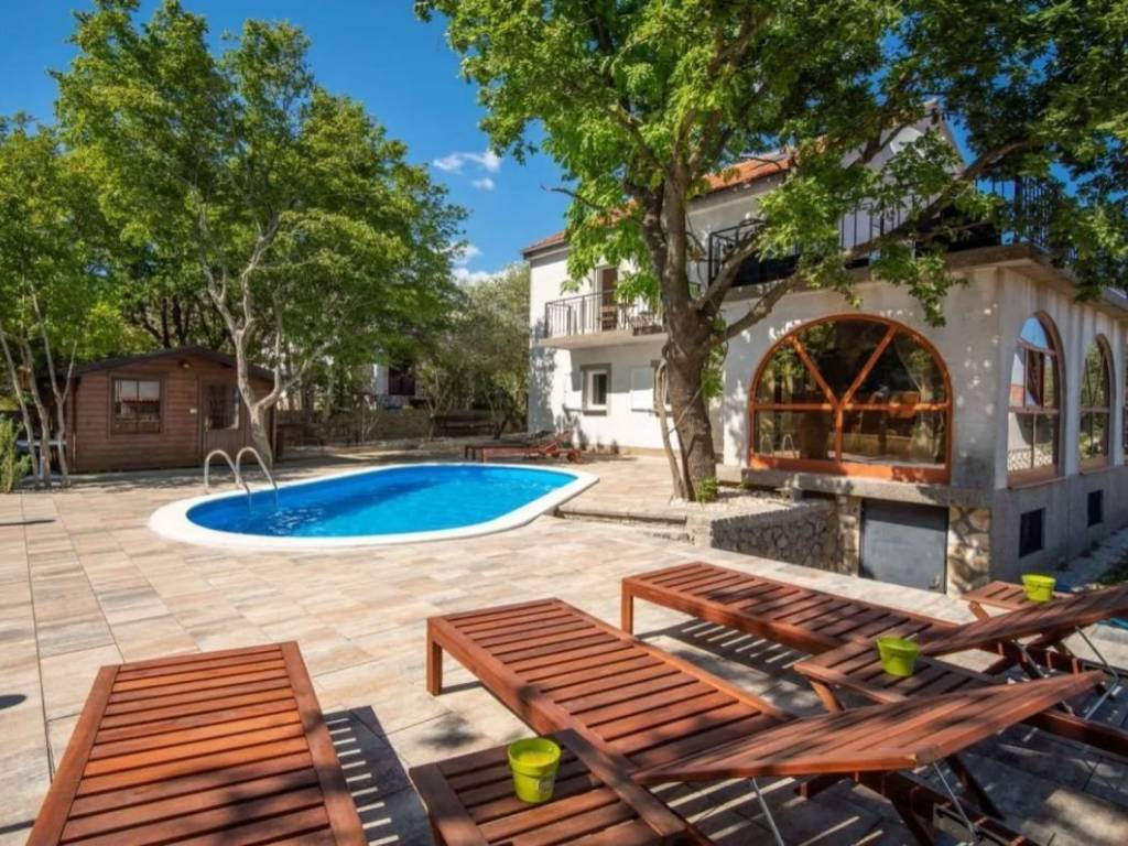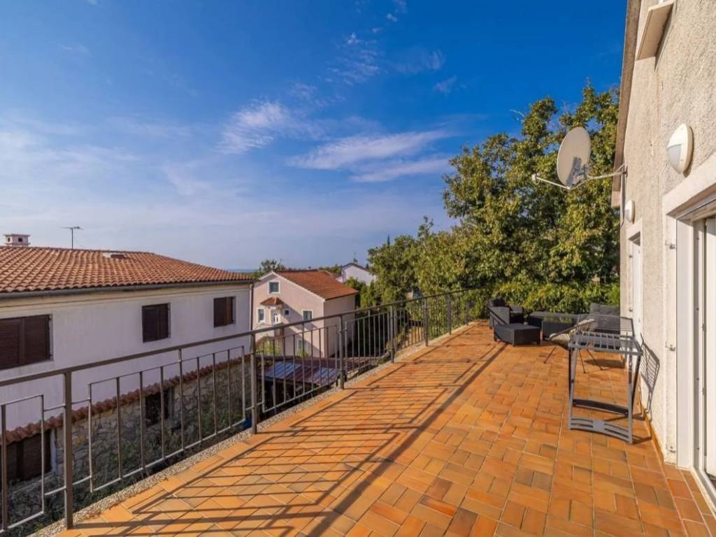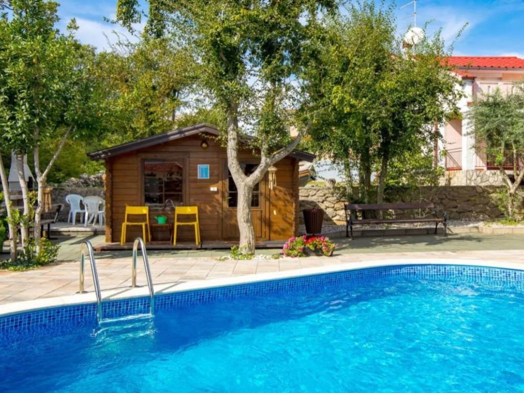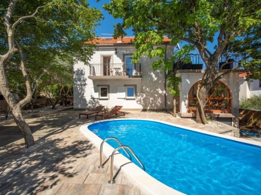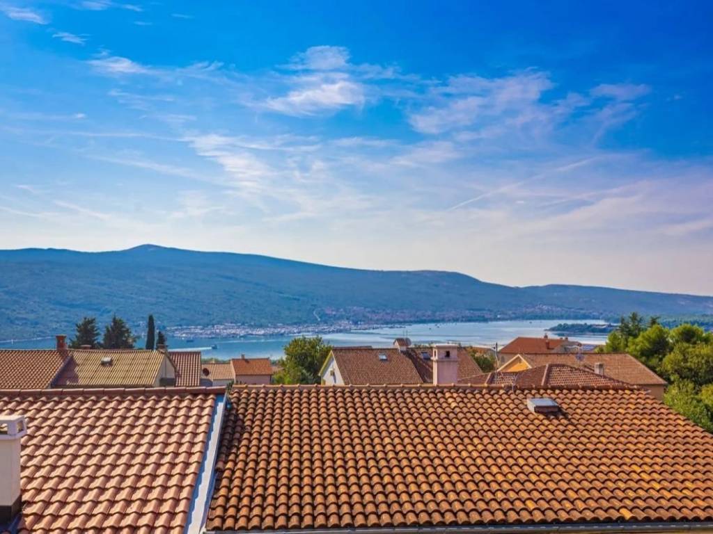 Otok Krk, grad Krk, Kornić, prodaja samostojeće kuće površine 250 m2, s bazenom i pogledom na more. Kuća se sastoji od suterena s garažom, prizemlja s dnevnom sobom, kuhinjom, blagovaonom, dvije spavaće sobe, kupaonice i terase, prvog kata s četiri spavaće sobe, kupaonicom, dva balkona i terasom te potkrovlja. Klimatizacija, električno centralno grijanje, pomoćna drvena kućica s kuhinjom, četiri parkirna mjesta. Mirna lokacija, 900 m od mora.