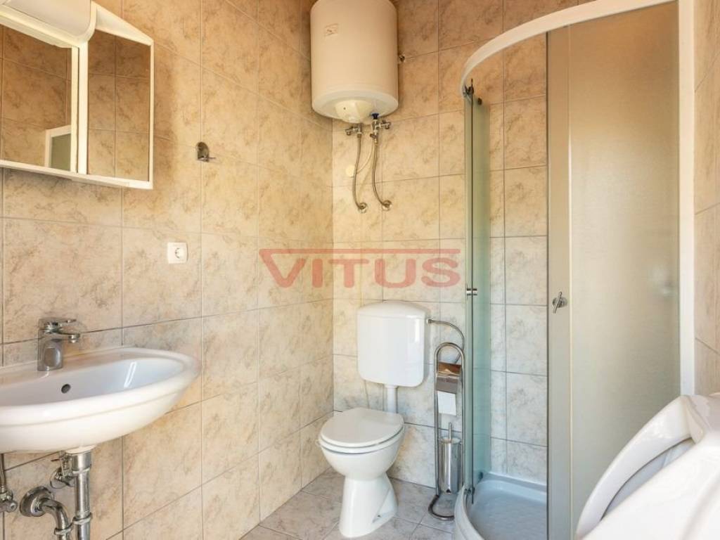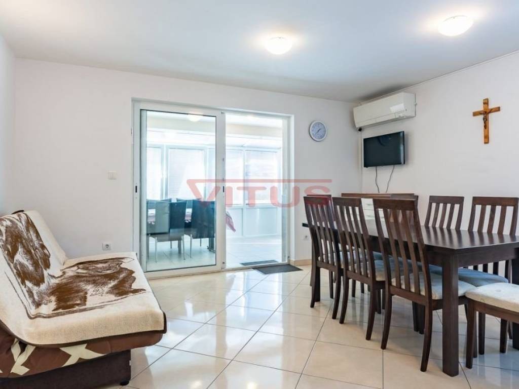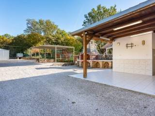 Island of Krk, Malinska! Two bedroom apartment of 59 m2 is located on the ground floor of an apartment building in the surroundings of Malinska! The apartment consists of an entrance area, a kitchen with a dining room and a living room, a closed terrace, two bedrooms and a bathroom. The special feature of this property is the spacious garden of a total of 503 m2 with a large stone fireplace, a covered summer kitchen with a toilet, an additional covered parking space and two auxiliary buildings. The apartment is air-conditioned and sold furnished. It is located in a quiet area, 1500 m from the sea.
