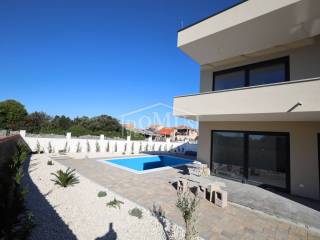 A beautiful family house with modern architecture and a very functional layout in Bogdanovići, in a quiet location, 4.5m from the pebble beach on Jadrija. The house is a semi-detached building (west side) on two floors: Ground floor + 1st floor with 132.45m2 of total usable area and 250m2 garden with an outdoor pool of 24m2 and a spacious parking space. The ground floor has an entrance hall, a spacious living room, a kitchen and a dining room, a bedroom, a storage room, a bathroom, a large terrace with a summer kitchen and a swimming pool. There are three bedrooms and two bathrooms on the first floor. The house is built with modern and high-quality materials such as: thermal facade 10 cm, anthracite-colored carpentry with electric roller blinds and mosquito nets, modern sanitary ware in the bathrooms, electric underfloor heating in all bathrooms on the ground floor and on the first floor, all bedrooms and the living room are equipped with air conditioners. The house has a paved parking space.