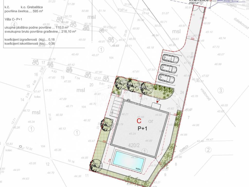 Grebaštica, quiet location, attractive building plot with sea view, surface area 1,716m2. The land has project documentation and 3 building permits for the construction of 3 detached family houses, each house on two floors P+1 with a total area of 218m2 and a swimming pool of 32m2. The land has a regular shape, with a gentle slope towards the south side. The distance from the town center and the beach is 670 m.