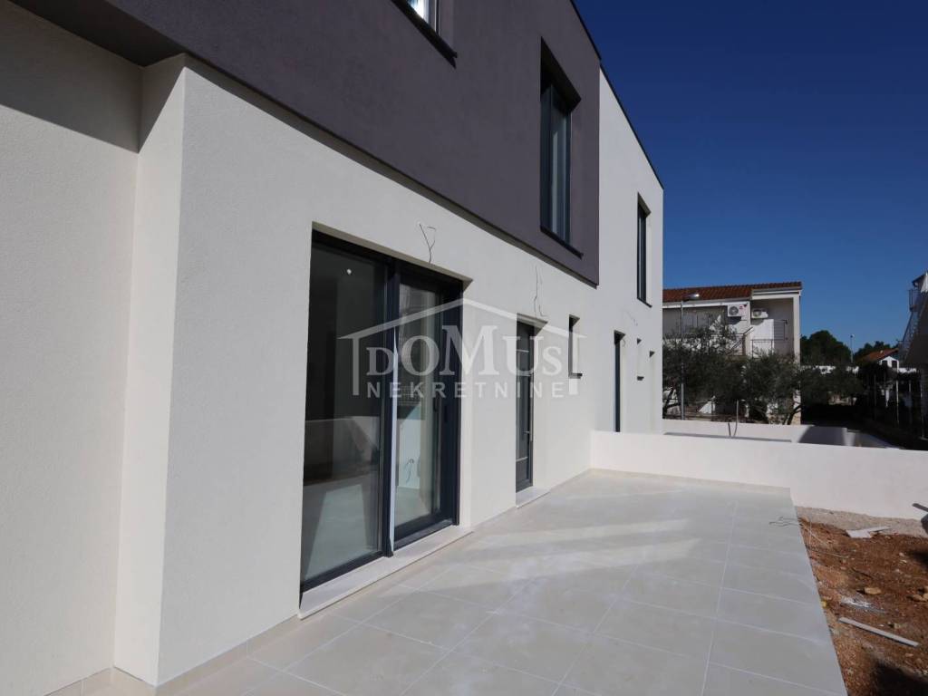 Srima, attractive location, family house of modern architecture, 240m from the pebble beach. The house is a semi-detached house, on two floors, ground floor + 1st floor. House S1 (southeast side) has a total usable area of 128.07m2 and a 105m2 courtyard with two parking spaces. The ground floor consists of an entrance / hallway, toilet, utility room, kitchen, large living room with dining room that has access to the terrace and courtyard. On the 1st floor there are three bedrooms, two bathrooms and a storage room / laundry room. The house is built with top quality materials, equipped with security doors, ALU lift-sliding walls with electrically controlled roller shutters, mosquito nets, glass railings, electric underfloor heating in the bathrooms as well as in the kitchen and living room, each room with air conditioning and TV / SAT connection. Hot water heating is via a boiler located in the storage room, preparation for video surveillance for two external cameras. The stairs are cantilever (floating) steel structures with wooden cladding and anthracite-colored steel rod railing. The 2.8m x 6.4m swimming pool is lined with ceramic mosaic tiles, and apart from the green part of the yard, the surroundings and parking lot will be paved with concrete pavement. The expected move-in is spring 2025.