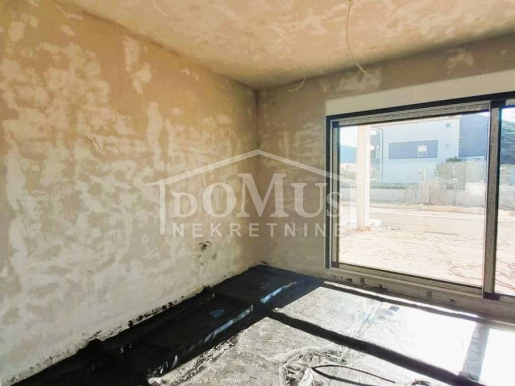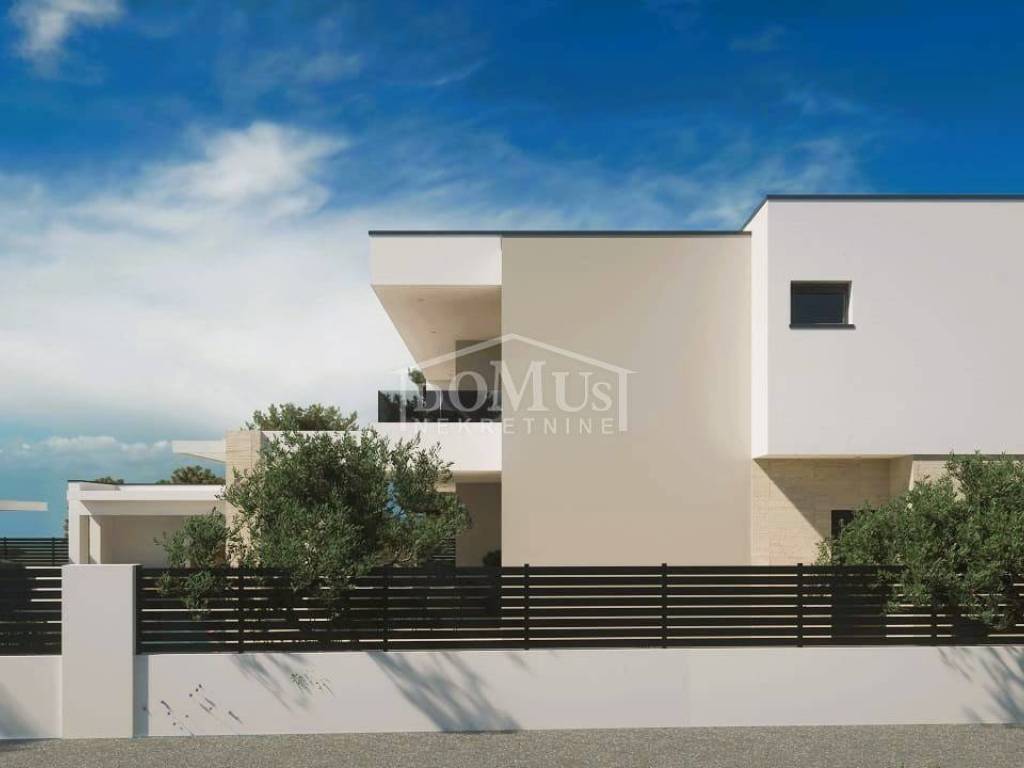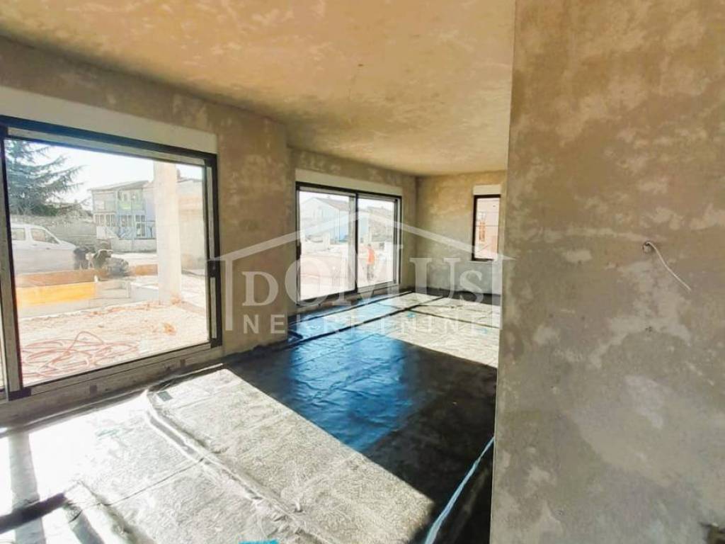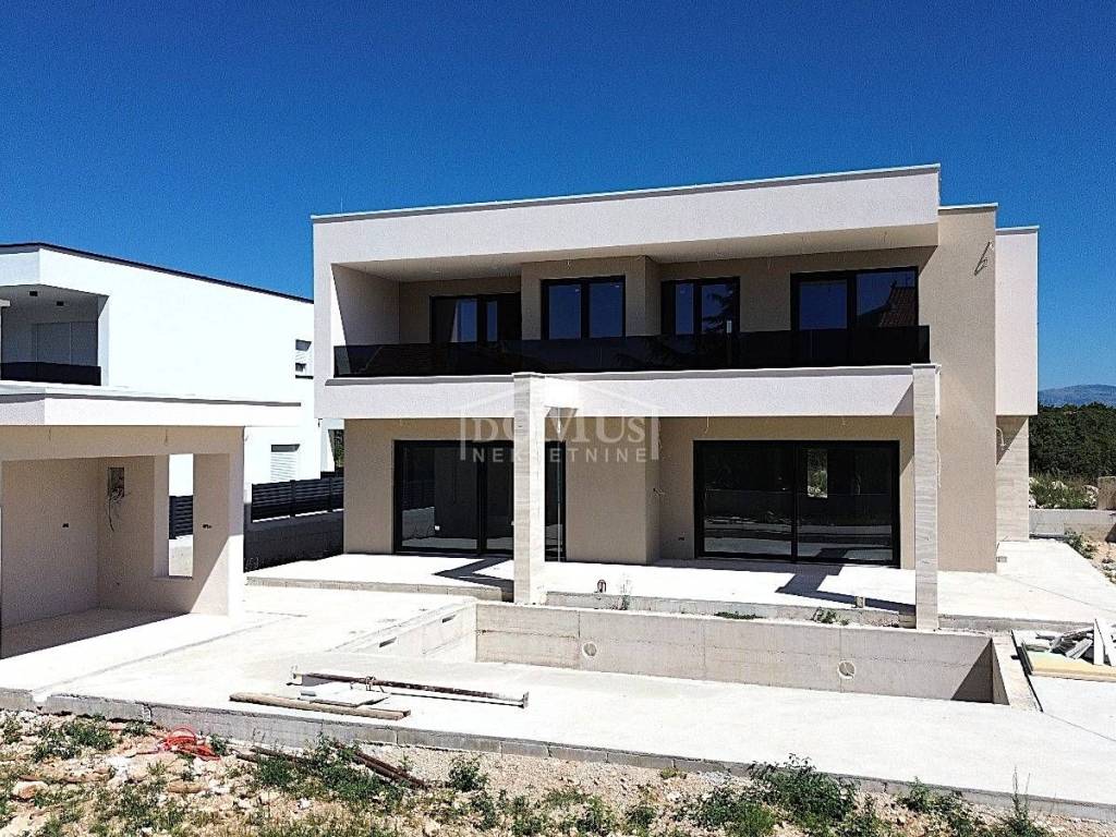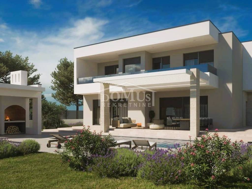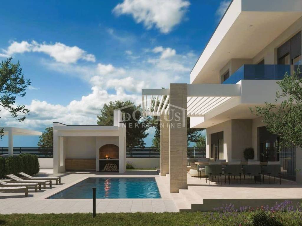 Located in Lozovac, in the hinterland of Šibenik, just 2.5 km from Krka National Park, there is a detached house with modern architecture and a functional layout with a swimming pool and a total usable area of 242.28 m². It is set on a 727 m² plot. The house consists of a hallway, a toilet, a bedroom with an en-suite bathroom, a kitchen and a dining room, and a spacious living room with access to a large, partially covered terrace of 41.36 m², next to which there is a large swimming pool of 33.22 m² and a paved sunbathing area. The first floor consists of a hallway, three bedrooms, one of which has an en-suite bathroom, as well as a separate bathroom and dressing room. All three bedrooms have access to a large terrace of 24.36 m². The house is equipped with a Schuco AWS 75 aluminum entrance door with a double-sided concealed leaf, a security electric lock, and a code book. The lift-and-slide walls are made of PVC Gealan, and the windows are made of Gealan S 9000. Electric shutters, triple glazing, and mosquito nets are also included. Heating is provided by water-based underfloor heating and a built-in wood-burning fireplace. Air conditioning is installed in all rooms. The house is prepared for a solar power system on the roof. Video surveillance has also been installed. The flooring in the living room, hallways, and bathrooms is made of ceramic tiles, while the stairwell is paved with stone. The bedrooms are covered with three-layer parquet. The facade of the house is 10 cm thick. The pool deck and terrace are covered with ceramic tiles, while an aluminum pergola covers a part of the pool. The house has a summer kitchen with a barbecue, covered parking, and an aluminum fence along the outer walls. The sliding patio doors are powered by an electric motor. The center of Šibenik is 8 km away, and the beach is 11 km away.