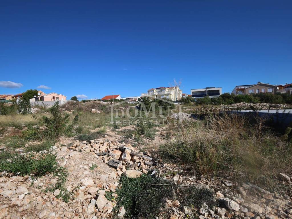 Building plot of 600 m² located in zone M – designation 1.4. The land is flat, uncleared, and has a square shape. The dimensions of the plot are approximately 22 m x 26 m.
