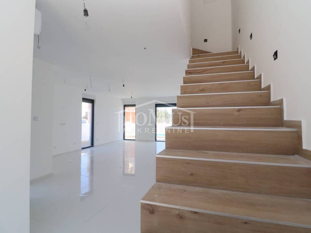 Family house in Srima, 550m from the pebble beach and the town center. The house is a two-story building, on two floors Ground floor + 1st floor with 117.57m2 of total usable area and 50m2 garden with a large terrace and a 12m2 pool. The ground floor of the house consists of a covered entrance, a guest toilet, a hallway, a large living room with a kitchen and a dining room with access to a covered terrace with a swimming pool and an adjoining yard. On the first floor of the house there are three bedrooms, two bathrooms, a hallway, a wardrobe and a large terrace of 14.89m2. The terrace is covered with a pergola. The house will be equipped with burglar-proof doors, ALU carpentry with electrically operated blinds, underfloor heating in the living room and bathrooms, each room with air conditioning, a 200l hot water boiler, video surveillance installations. The environment will be decorated with Mediterranean plants. Paved parking area.