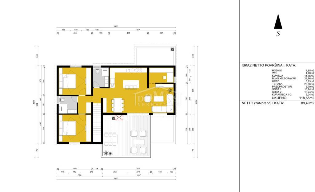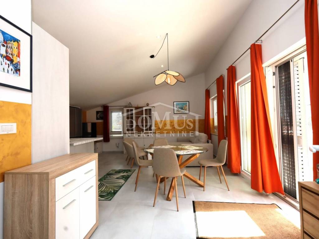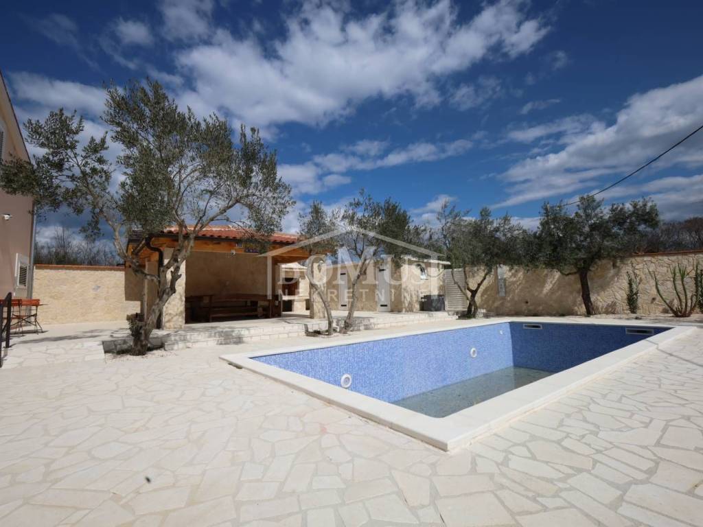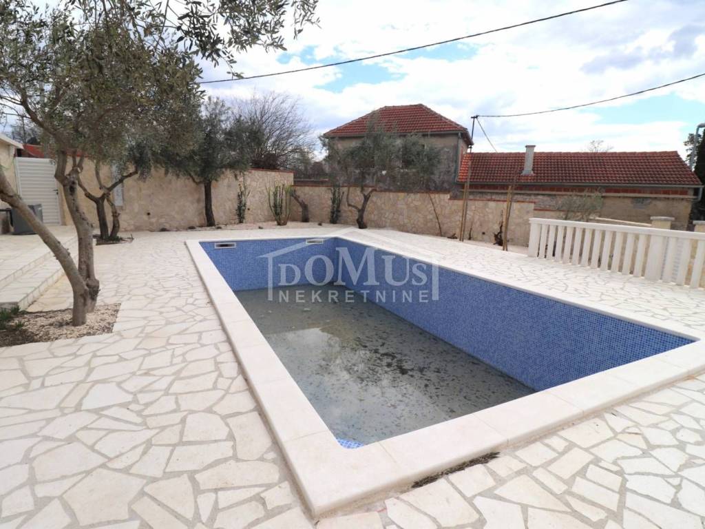 Beautiful house with a swimming pool on a plot of 927m2, in a quiet location. The house is spread over two floors: ground floor + first floor with a total of 216.60 m2 of usable area. On the ground floor there is an apartment with 119.84 m2 consisting of a kitchen with a dining room, a living room with access to a covered glazed terrace, two bedrooms, one of which has its own bathroom and a separate bathroom. An internal staircase leads to the first floor where there is a second apartment with a total of 96.76 m2 of usable area consisting of internal stairs, a hallway, two bedrooms, two bathrooms, a kitchen with a dining room and a comfortable living room with access to a large uncovered terrace. The yard is fenced, the property is adapted for people with disabilities, and has video surveillance. An integral part of this beautiful property also includes a heated swimming pool 10m x 4m, a sunbathing area, a gazebo behind which there is a wine cellar, and next to the gazebo there is an outdoor fireplace, a machine room and a storage room. The yard is beautifully decorated with Mediterranean plants, while the interior is of modern design. Behind the house there is a garden house and covered parking. The distance to the beach in Pirovac is 14 km.
