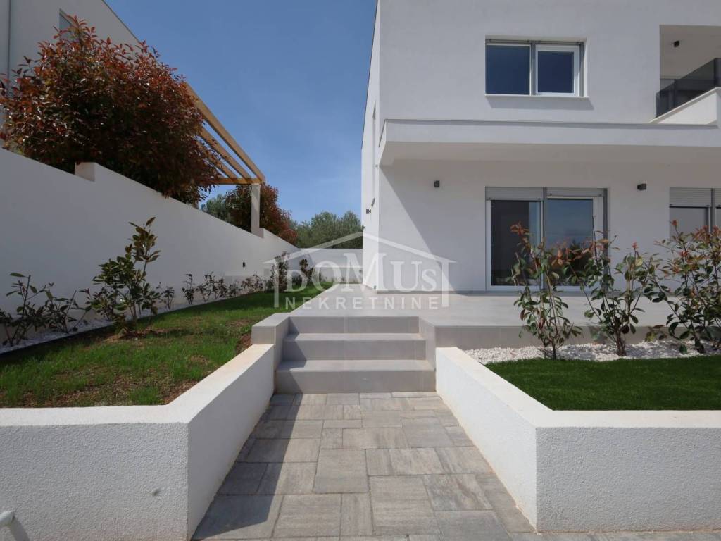Vodice – newly built, completed and immediately move-in family house of modern architecture and excellent layout. The house is part of a semi-detached building and extends over two floors, ground floor and first floor, with a total of 162 m² of usable area. It has a spacious parking space for three vehicles and a landscaped green garden of 105 m². The ground floor consists of an entrance hall, guest toilet, storage room, large living room connected to the kitchen and dining room, with access to a large terrace of 38.66 m². Internal stairs lead to the first floor where there is a hallway and three bedrooms, one of which has its own bathroom and a partially covered terrace of 7.68 m², while there is another additional bathroom next to the other rooms. The house is equipped with security doors, PVC joinery, electric roller shutters, mosquito nets, high-quality ceramic floors, underfloor heating in all bathrooms and the living room, air conditioning in the living room and all bedrooms, and installations for telephone, internet and satellite television. It is 900 meters from the town center and 1,270 meters from the well-maintained beach.