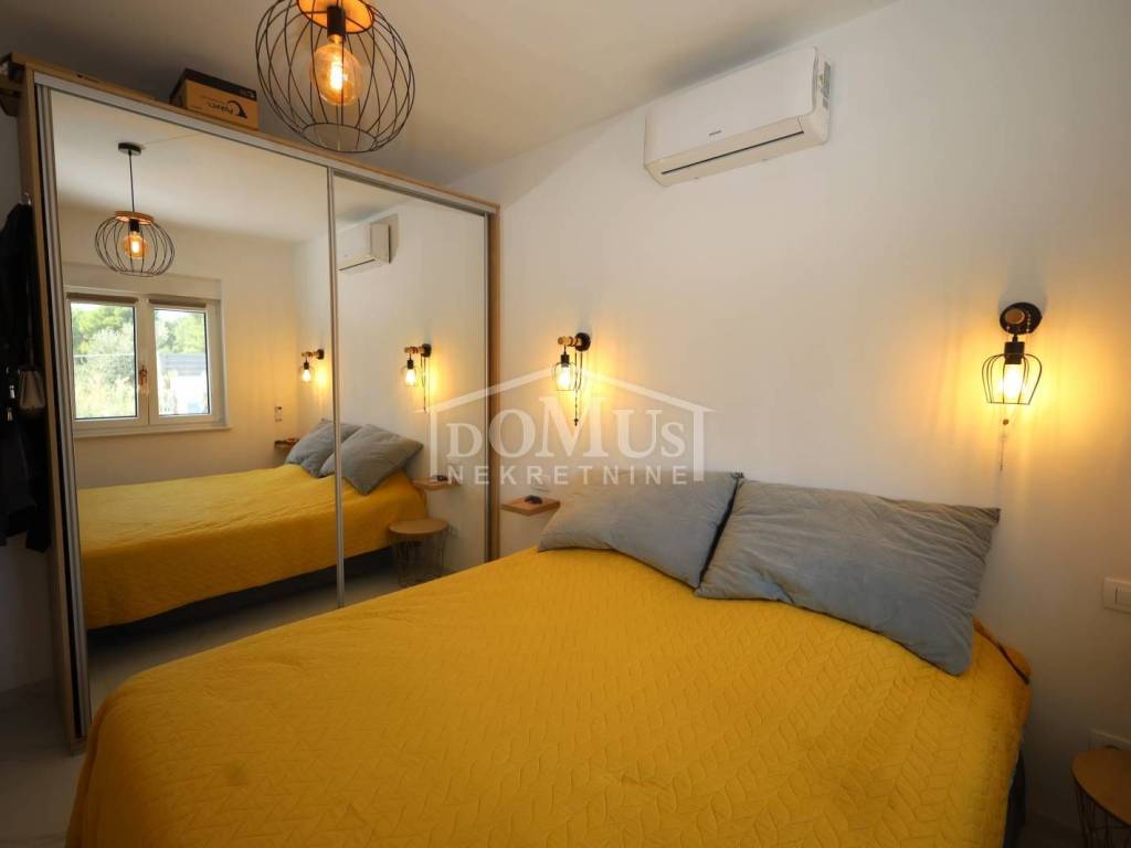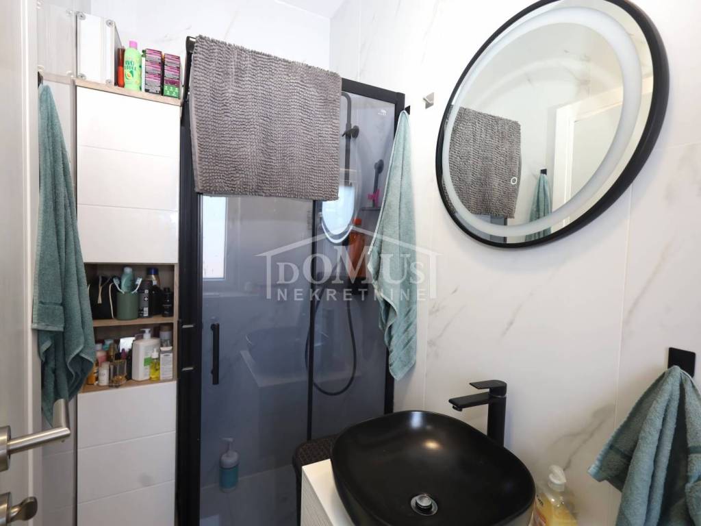 In a quiet location, a modern family house with a functional layout. The house is a semi-detached property on two floors (ground floor + first floor), with a total usable area of 99.08 m², including a yard of approximately 82 m² and parking space for two cars.The ground floor consists of a hallway, a bathroom, one bedroom, a spacious living room with dining area, a kitchen, and access to the garden. Interior stairs lead to the first floor, which includes a hallway, two bedrooms, and a bathroom.The house is fully furnished, and the furniture is included in the property price. It is equipped with security doors, PVC joinery with built-in shutters, electric shutter lifts, high-quality ceramic flooring, underfloor heating in all bathrooms and the living room, and air conditioning in the living room and each bedroom.