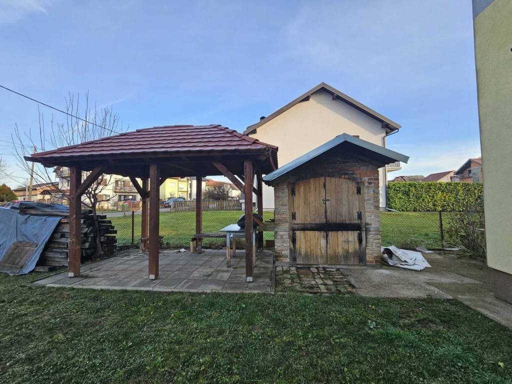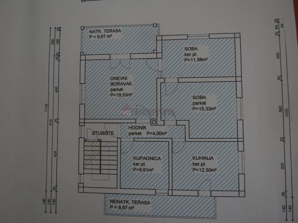 Trosoban stan na 1.katu stambene zgrade s tri stana u mirnoj i slijepoj ulici, u blizini škole, vrtića, javnog prijevoza i dr. Sastoji se od ulaznog hodnika, dnevnog boravka, kuhinje s blagovaonicom, kupaonice, dvije spavaće sobe, dvije natkrivene terase, ukupne površine 80 m2. Uz stan su etažirana dva parkirna mjesta ispred zgrade i vrt sa sjenicom i pečenjarom površine 123 m2. Ukupna površina stana s pripadcima iznosi 98,05 m2. Posjeduje vlastite priključke struje, vode i plina. Uredna vlasnička dokumentacija.