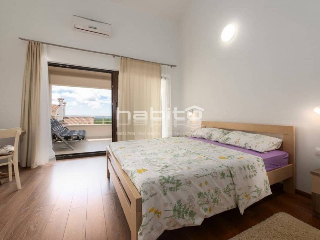 The house of approx. 160 m on two floors consists of a ground floor where you will find a kitchen with a dining room and a spacious living room with a fireplace and two exits to a covered terrace, one bedroom with with its own bathroom, a separate toilet. On the first floor of the house there are two bedrooms with its own bathroom. Both rooms have a beautiful panoramic sea view and the view of the village of Visnjan.