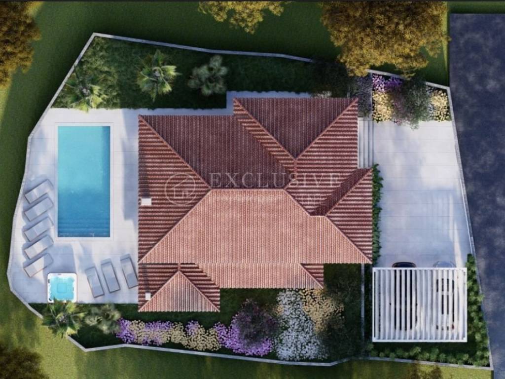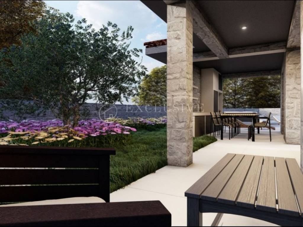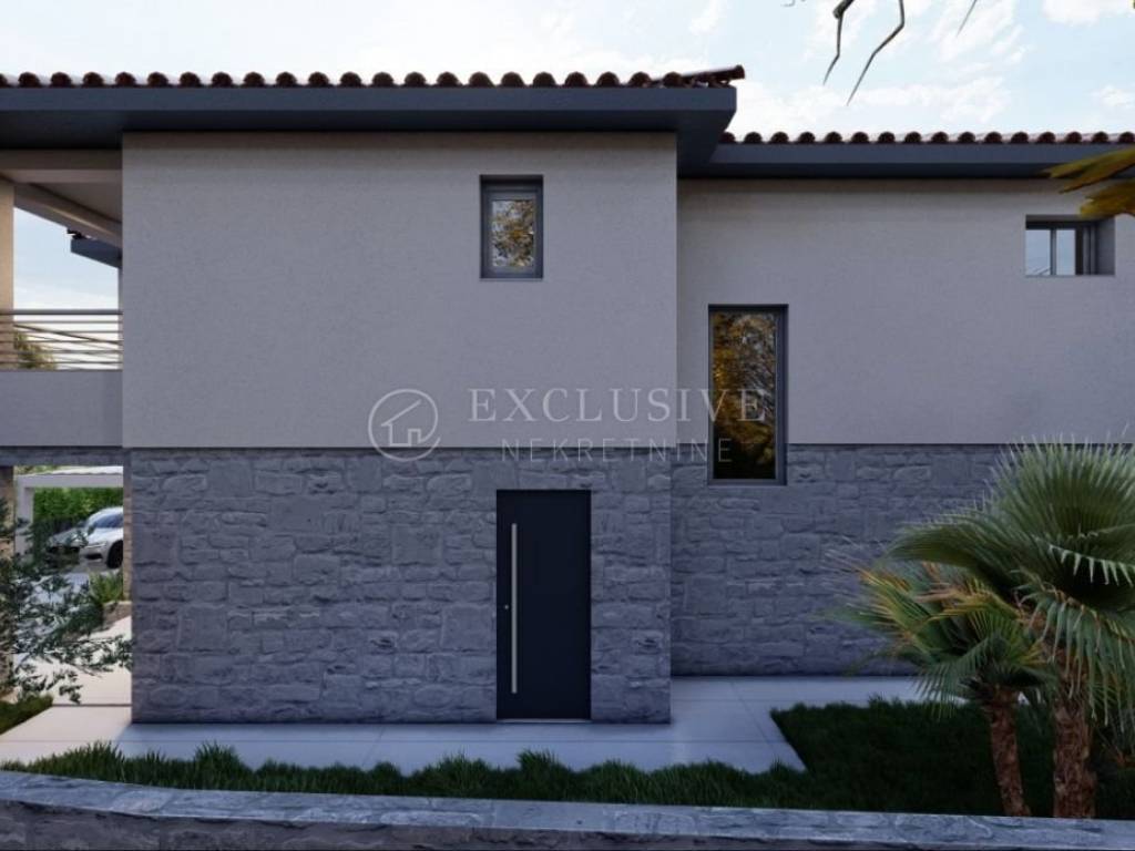We are selling a villa with a swimming pool under construction in a beautiful and quiet location near Dobrinje on the island of Krk. The villa has a living area of ​​300 m2 and is built on a plot of 610 m2. It will be distinguished by the comfort and size of the rooms, high quality construction, large covered terraces, a swimming pool of 36 m2 and maximum privacy. On the ground floor there is an entrance hall, a kitchen with a dining room and a living room, a guest toilet, a bedroom with its own bathroom, from which there is access to the garden with a swimming pool and a sunbathing area behind the house, and a covered terrace in front of the house. On the floor, which can be reached via the internal staircase, there is a master bedroom with a wardrobe and a spacious bathroom, and two bedrooms, each with its own bathroom, one of which has its own wardrobe. Quiet location only 2 km from the sea. Planned completion of works 6/2025.