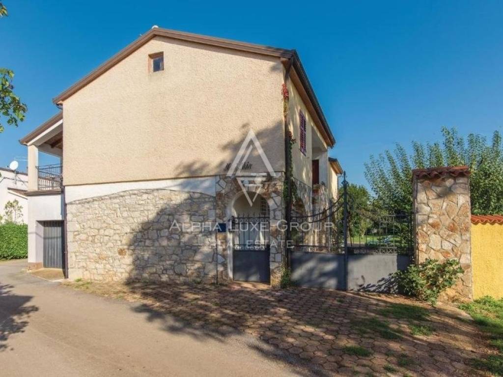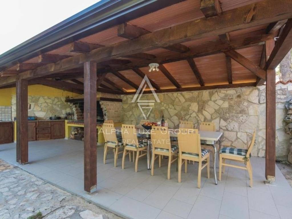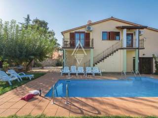 The landscaped yard features include a swimming pool and sun deck, a summer kitchen, and a parking lot with six parking spots. The house is heated by central gas underfloor heating.