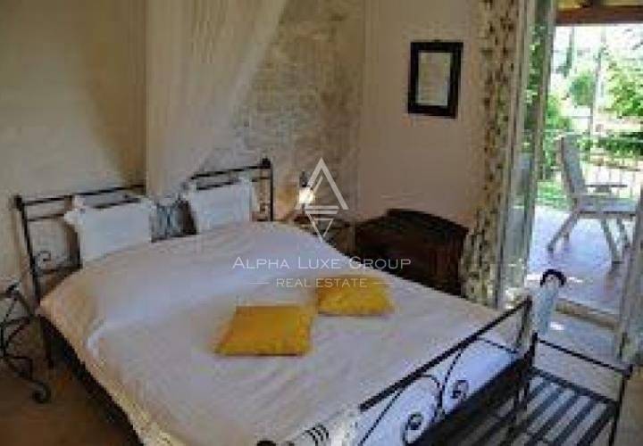 The entrance to the estate is lavishly adorned and features towering cedars and cypresses that provide a veil of privacy from the road. The garden enveloping the pool and terrace boasts a thriving assortment of mulberries, olives, lemons, figs, and fragrant herbs.