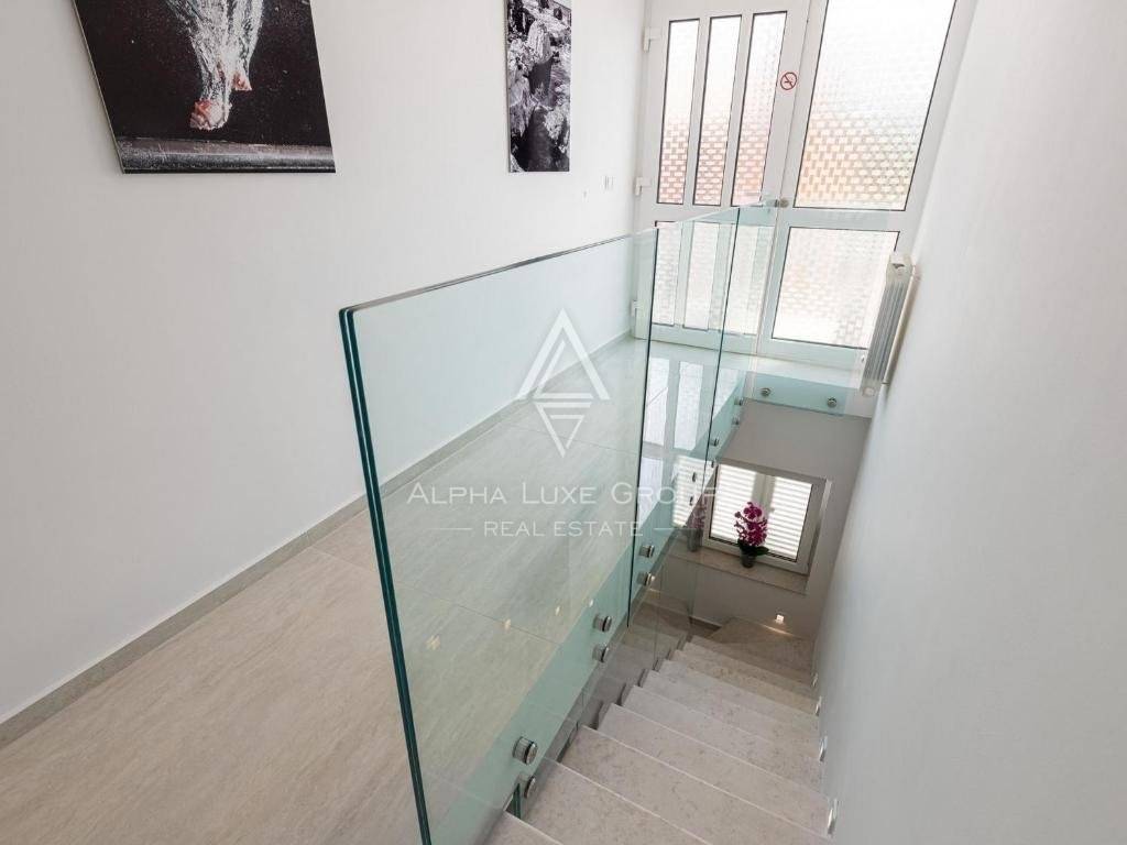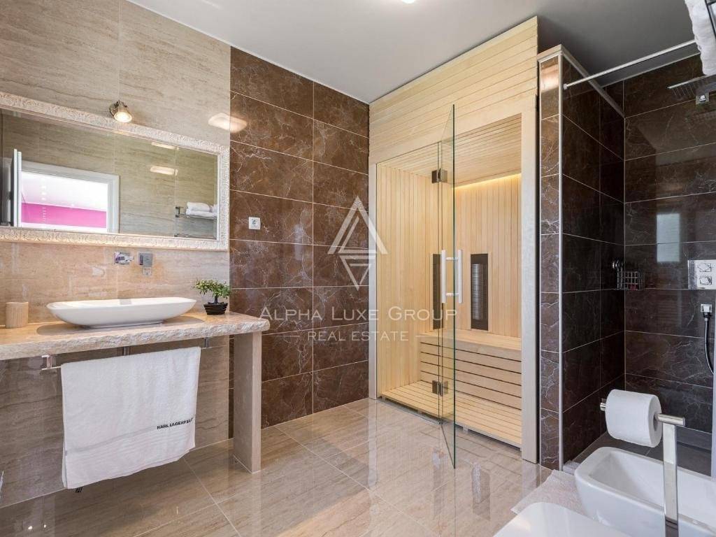 Upstairs the house consists of four bedrooms, each with its own bathroom. The spacious master bedroom of 35 m2 has its own bathroom, jacuzzi, sauna and exit to the terrace with beautiful sea views.
