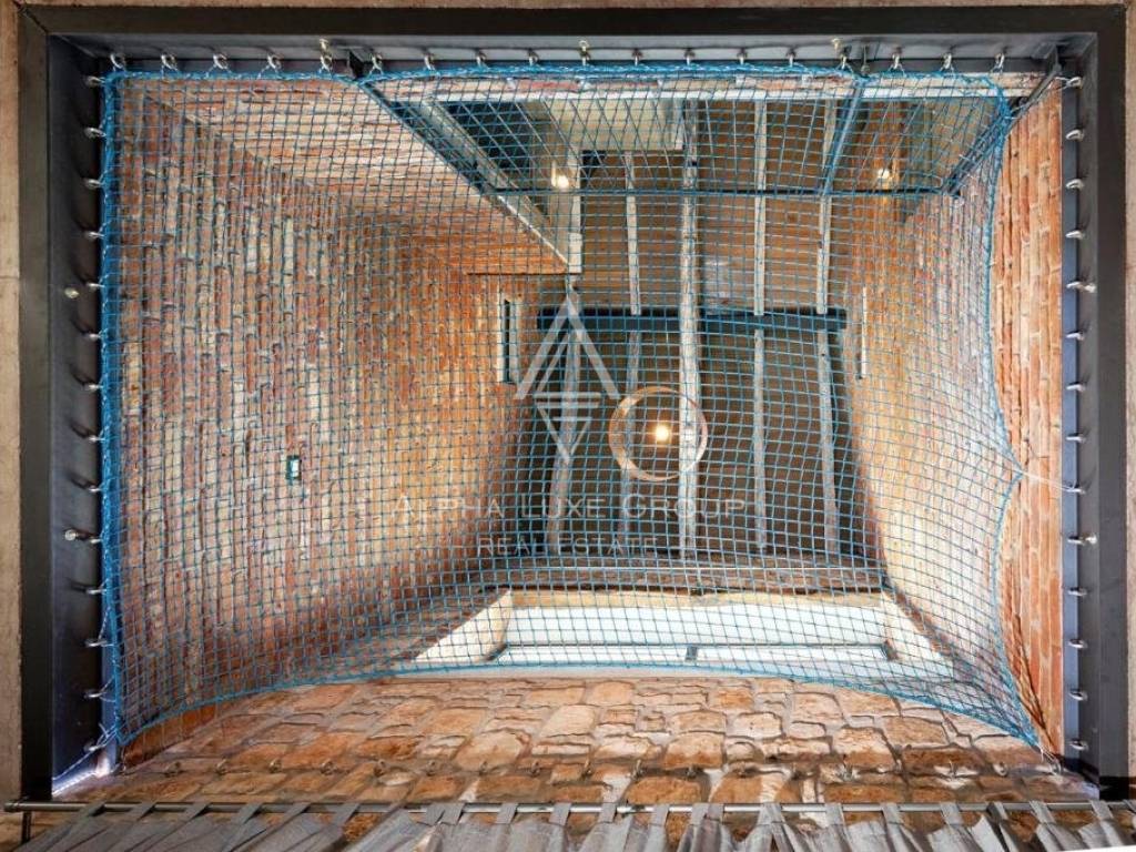The ground floor opens to a welcoming kitchen, dining, and living area, leading to an inviting yard. Also on this level is a uniquely designed bedroom with a suspended bed and an en-suite bathroom. Ascend the internal stone staircase to discover two additional bedrooms, each with private bathrooms and terraces. The highlight is a bedroom with a loft space for extra beds, and a 700 kg weight net above the living room, perfect for relaxing TV sessions.