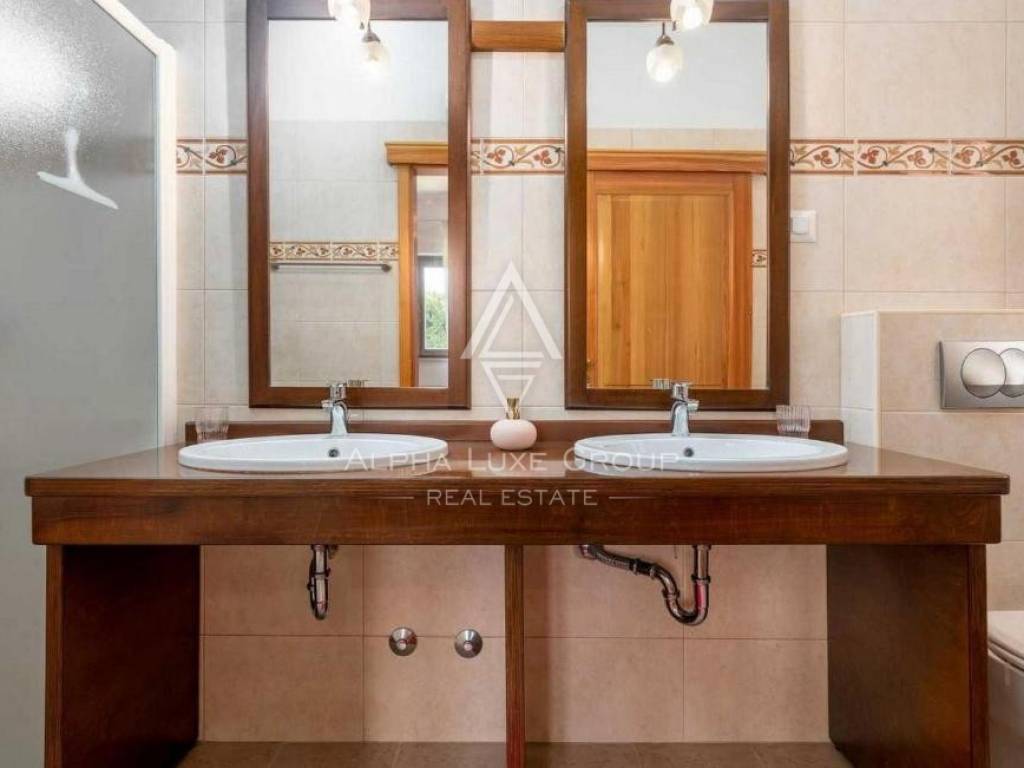 The ground floor features an open concept layout that connects the kitchen, dining area and living room, with direct access to a covered terrace equipped with an open fireplace. This level also includes a bedroom with an en suite bathroom, a guest toilet and a boiler room. The first floor comprises two additional bedrooms, each with its own private bathroom, along with a hallway leading to a terrace offering panoramic views of the surrounding landscape. The landscaped and fenced garden is designed in a Mediterranean style and includes a 23 m² swimming pool with a sunbathing area.