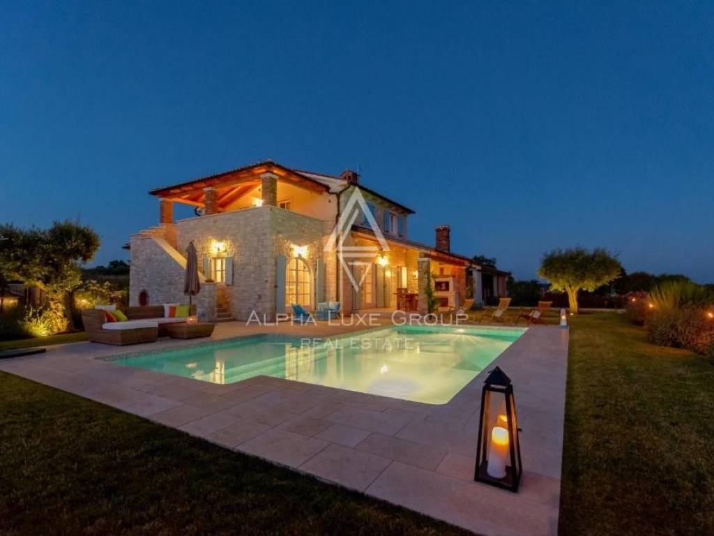 Set on a gentle hill overlooking the historic centre of Sveti Lovreč, this elegant villa combines traditional Istrian charm with modern comfort. Offering 210 m² of inviting interior space, the home features a warm and stylish living room, a fully equipped kitchen with dining area, three comfortable bedrooms and two beautifully finished bathrooms. Natural materials and Mediterranean textures are thoughtfully integrated throughout the interior to enhance its authentic character.