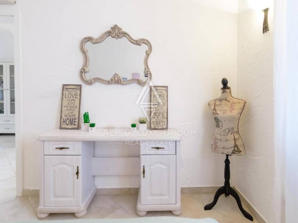 Large openings connect the living area with the beautifully designed outdoor space that includes a 57 m² private swimming pool and a spacious sun terrace, creating an ideal setting for relaxation. The covered outdoor lounge and landscaped garden further highlight the Mediterranean appeal, ensuring complete privacy while surrounded by greenery.
