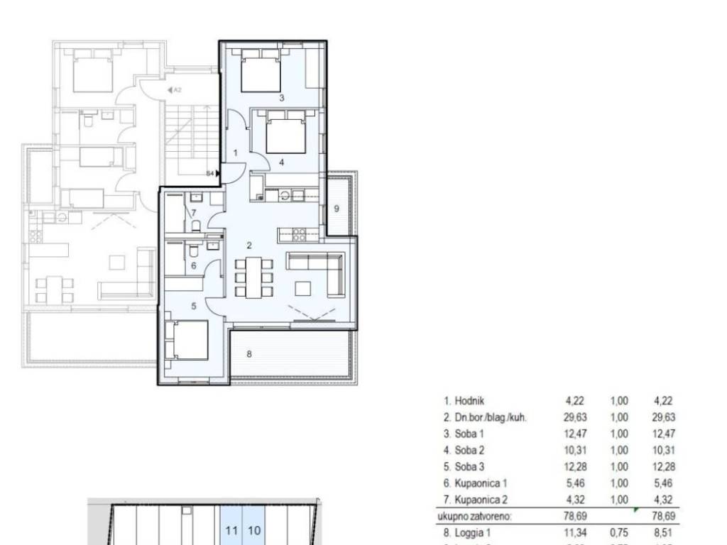 - entrance area / corridor, living room with kitchen and dining room, loggia, three bedrooms, two bathrooms, terrace, two parking spaces