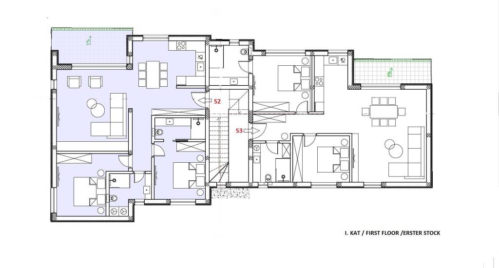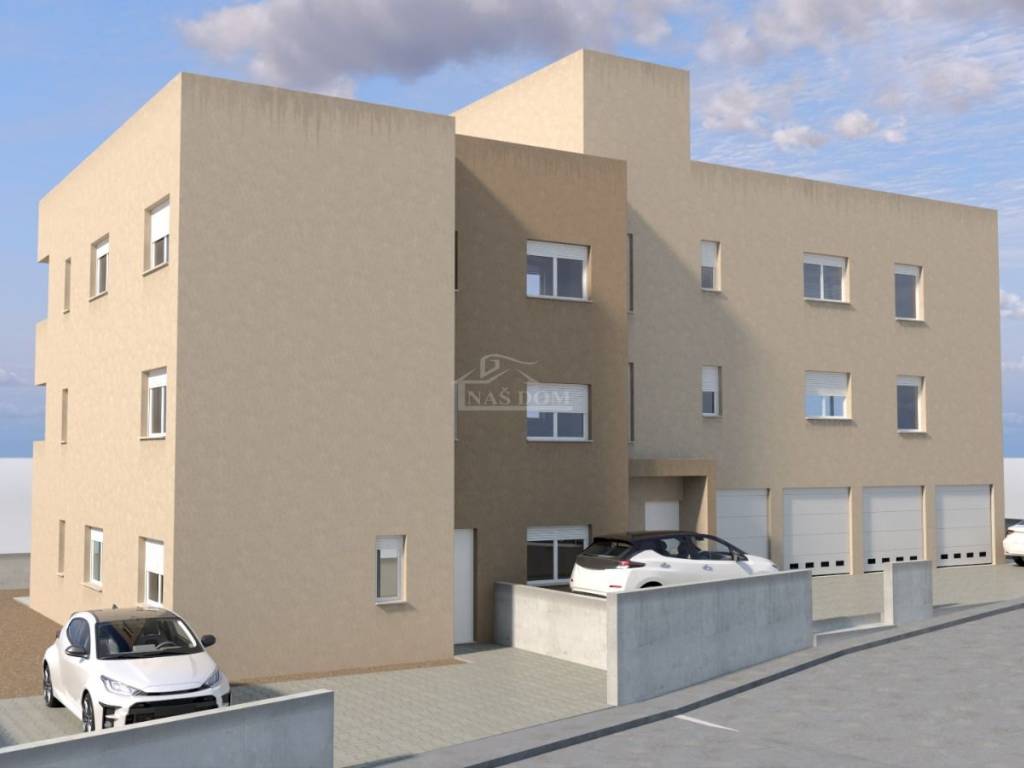Vodice - apartments in a new building are for sale in an attractive location. The building, with a modern appearance, has a total of 5 residential units and 4 floors in total: ground floor + 1st floor + 2nd floor + roof terrace. It is currently being constructed with high-quality materials and will be equipped according to the latest construction standards. Equipment highlights include: 10 cm EPS facade, white PVC exterior joinery by Gaelan, shutters with electric lifts, triple glazing, sliding walls, ceramics, laminate flooring in the rooms, electric underfloor heating in bathrooms, kitchen, and living room, air conditioning units in bedrooms and living room, EV vehicle charging connection in the garage, electricity and water connections on the roof terraces, and drainage for a summer kitchen, pre-installation for solar panels on pergolas (optional - for an additional charge)