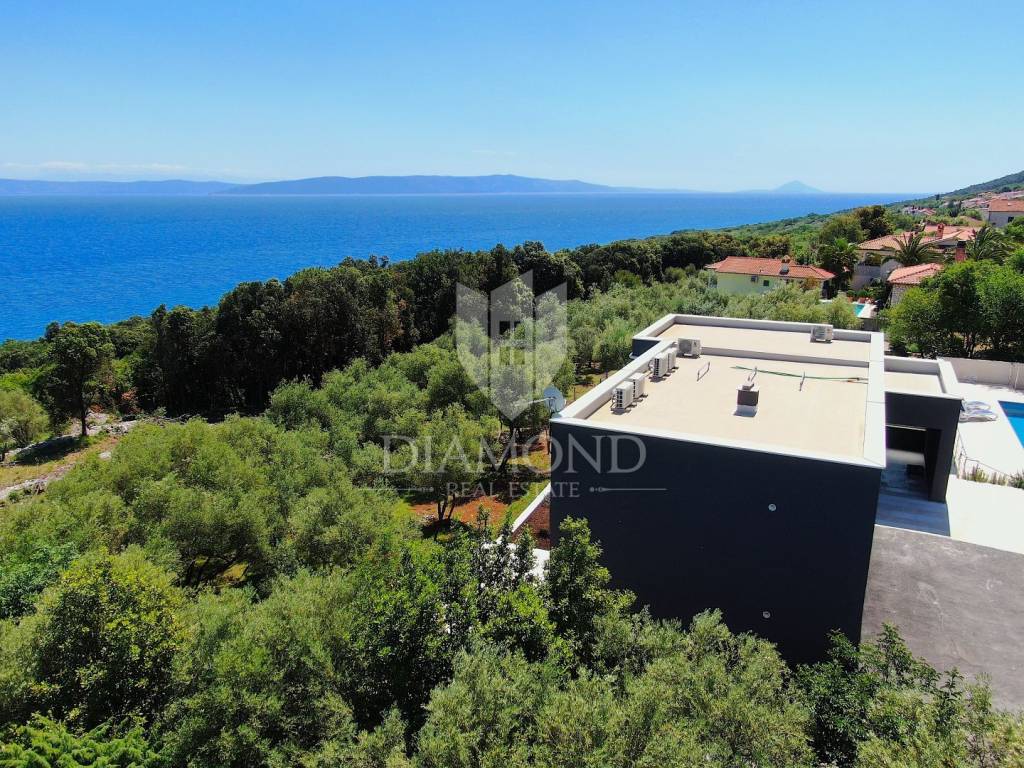 We are selling a newly built villa with a pool of modern design in an attractive location with an unforgettable sea view. In a small town known for its beautiful indented coast, untouched nature, beautiful beaches and clear sea, only 13 kilometers from the center of Labin, is located this unique Villa with enchanting sea views. It is located on the edge of a protected coastal area and an unobstructed view over the olive groves to the beautiful blue sea and surrounding greenery. The house is designed as a house with a total living area of 200 m2. The ground floor consists of a fully equipped kitchen and dining room with direct access to the beach pool. There are also three bedrooms with private bathrooms, a guest toilet and a storage room. The first floor combines a comfortable living room, a guest toilet and a bedroom with a bathroom. The house has a modern design of both exterior and interior, the details are minimalist and the emphasis is on the open space with large glass walls that provide beautiful sea views from every corner of this special Villa, but also enough natural light. Air conditioning is installed in each room, while a closed fireplace is provided in the living room for additional effect and comfort of the ambience. The house was built with top quality materials and is equipped with functional furniture. The garden is fully fenced and decorated and privacy and peace are guaranteed. There is parking for three cars, landscaped driveway, beautiful green area, while the crown of the garden is certainly a beautiful heated pool of 32 m2 with sunbathing area and lounge area under an effective pergola. The location of the house is also well located, only 100 meters from the sea and the first beach with a beach bar is 750 meters. The charming Old Town of Labin, as one of the major tourist attractions in the area with excellent restaurants, shops, beautiful galleries and museums is only 10 km away. This unique property due to its location, design and the content it offers represents a real opportunity in the market. It is certainly desirable as a tourist property where a quick return on investment through tourist rent during the summer season is guaranteed, and we can imagine it as a luxury oasis of peace that the new owner will keep to himself.