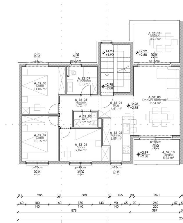 Solin, Mravince, na mirnoj lokaciji idealnoj za obiteljski život , predviđena je izgradnja manjeg stambenog objekta moderne vizure, s funkcionalnim rasporedom stambenih jedinica.Stan S3 - smješten je na prvoj etaži, a u naravni je trosoban stan. Sastoji se od ulaznog hodnika, kupaonice, WC-a, tri spavaće sobe i dnevnog prostora ( kuhinja s blagovaonicom i dnevni boravak ). Pripadaju mu dvije terase površine 5, 96 m2 i 10, 92 m2. Površina zatvorenog stambenog dijela iznosi 74, 33 m2, dok je ukupna 84, 25 m2.Obavezna je kupnja garažnog ili vanjskog parkirnog mjesta.Početak gradnje je predviđen u prvoj polovici 2026. godine.Za sva dodatna pitanja, stojimo vam na raspolaganju.