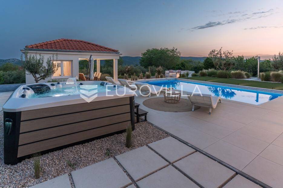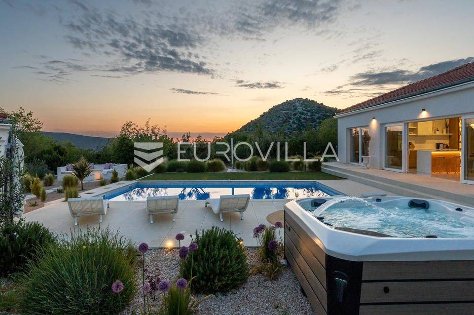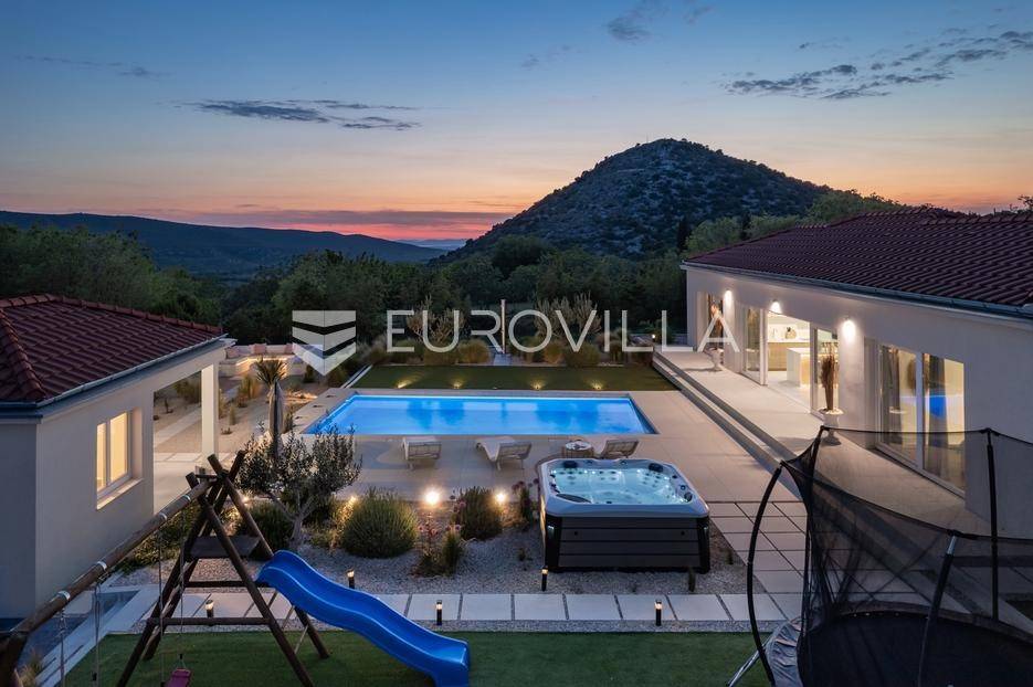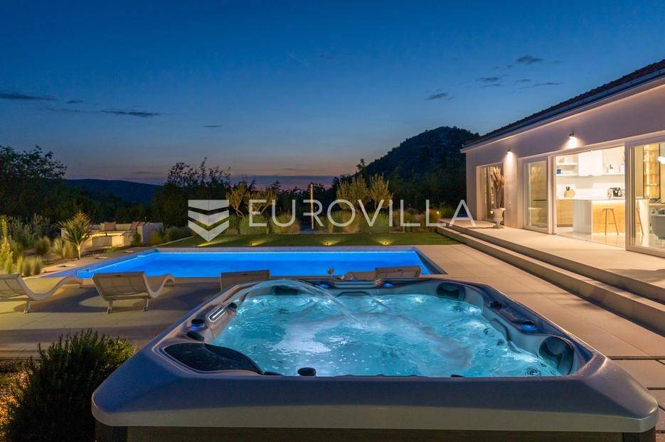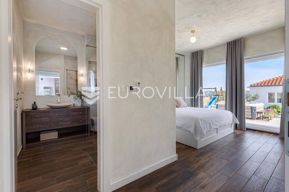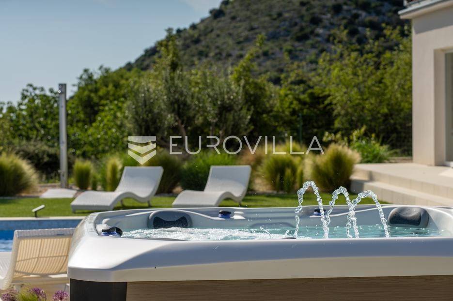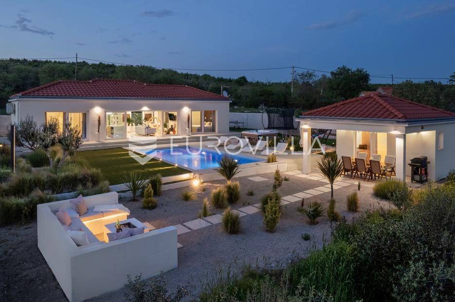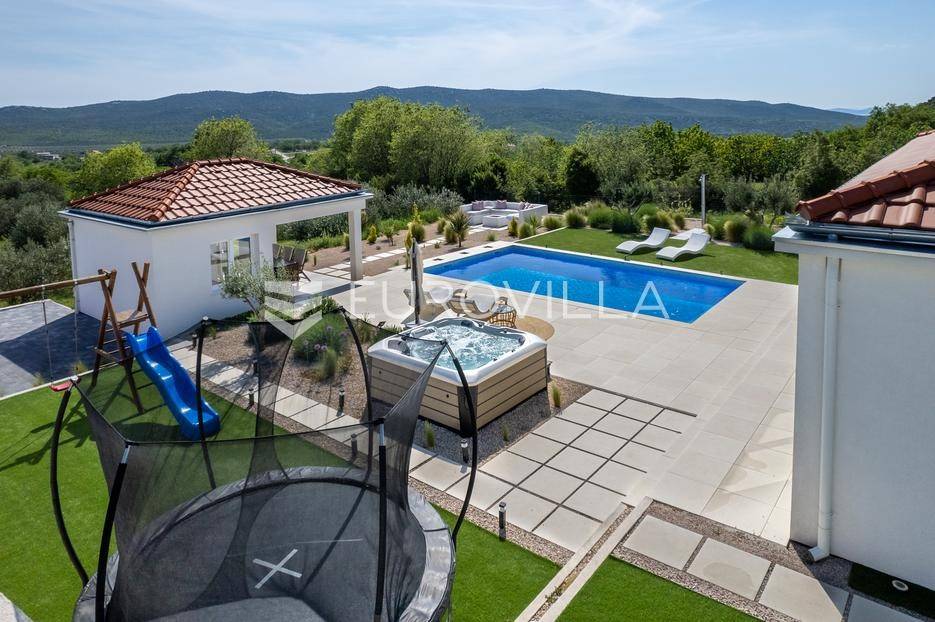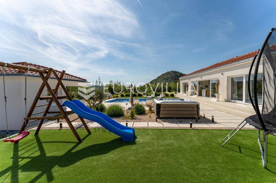 Vanjski prostor vile osmišljen je za uživanje na otvorenom. U prostranom dvorištu nalazi se bazen okružen ležaljkama, savršeno integriran u prostorni plan. Pored bazena nalazi se jacuzzi, idealan za opuštanje u bilo koje doba dana. Ljetna kuhinja opremljena je roštiljem i natkrivenom blagovaonicom, a tu je i dodatna kupaonica s odvojenim WC-om. Ovaj prostor nudi i dnevni boravak uz bazen, savršen za jutarnju kavu ili večernje koktele. Dječje igralište osigurava zabavu za najmlađe. Na krovu su postavljeni solarni paneli (Huawei 5 kW) koji osiguravaju besplatnu električnu energiju (fotografije su napravljene prije postavljanja panela).