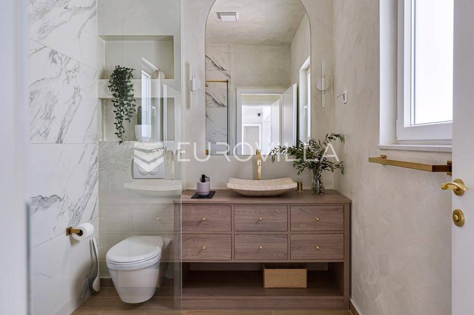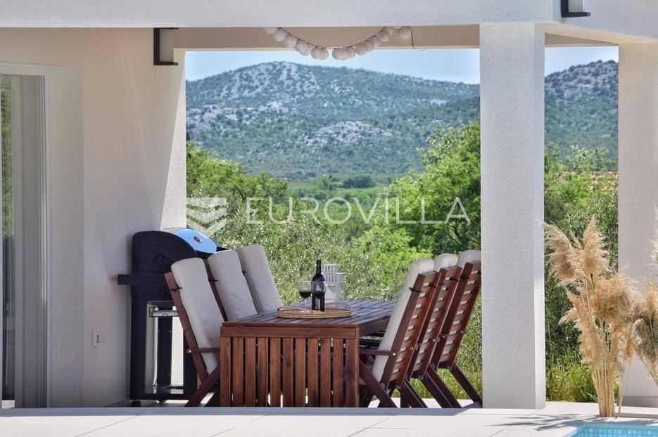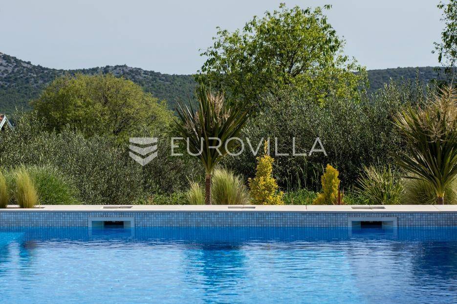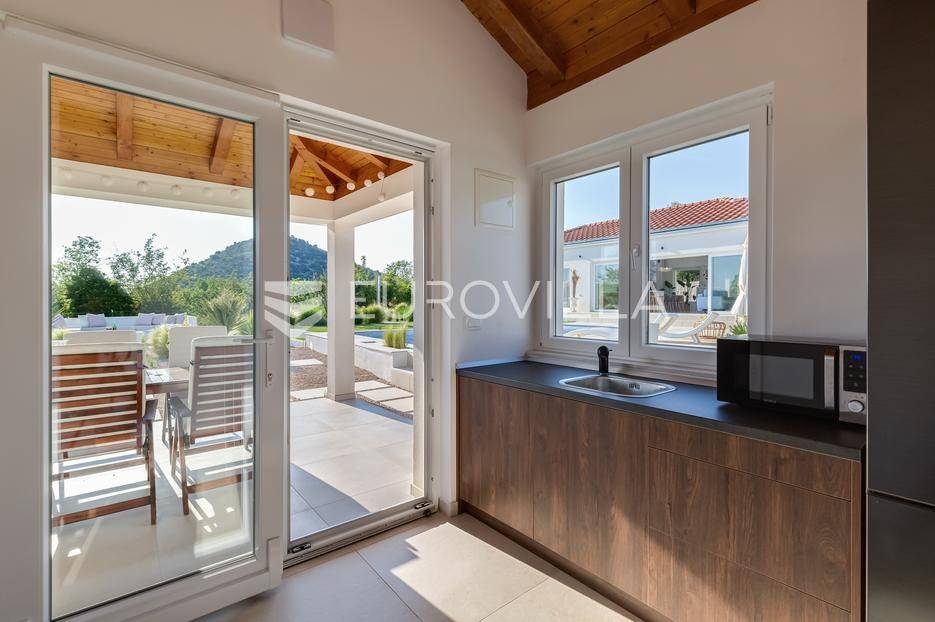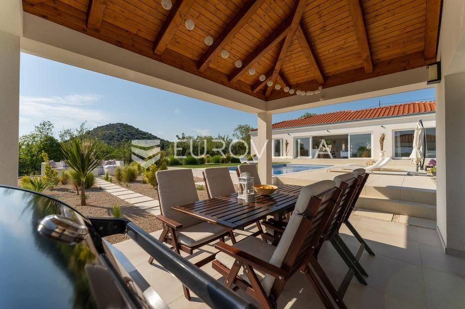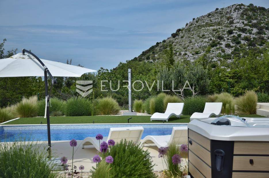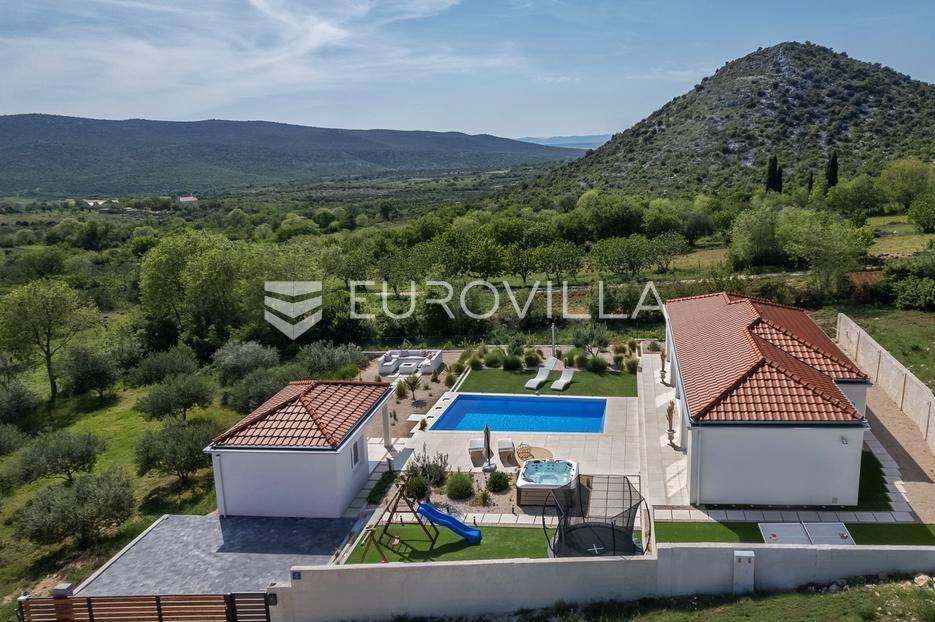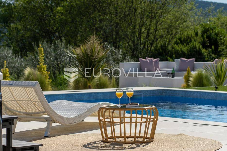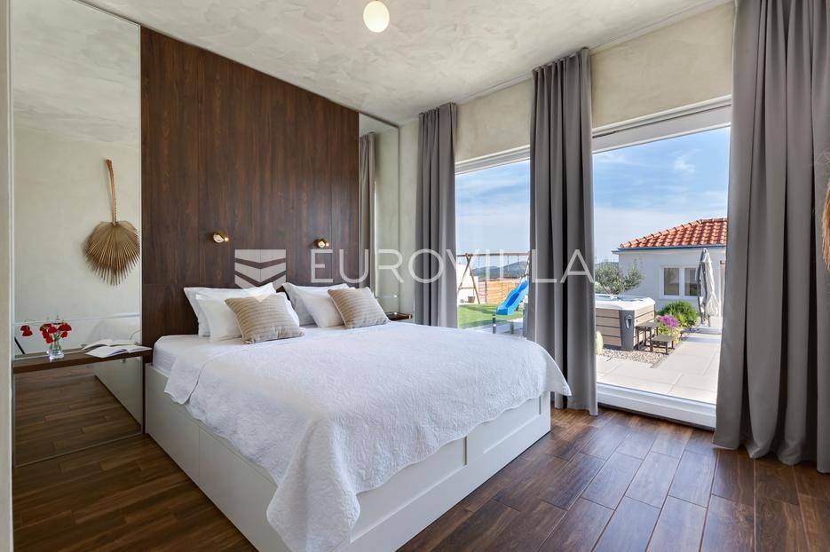 Vanjski prostor vile osmišljen je za uživanje na otvorenom. U prostranom dvorištu nalazi se bazen okružen ležaljkama, savršeno integriran u prostorni plan. Pored bazena nalazi se jacuzzi, idealan za opuštanje u bilo koje doba dana. Ljetna kuhinja opremljena je roštiljem i natkrivenom blagovaonicom, a tu je i dodatna kupaonica s odvojenim WC-om. Ovaj prostor nudi i dnevni boravak uz bazen, savršen za jutarnju kavu ili večernje koktele. Dječje igralište osigurava zabavu za najmlađe. Na krovu su postavljeni solarni paneli (Huawei 5 kW) koji osiguravaju besplatnu električnu energiju (fotografije su napravljene prije postavljanja panela).