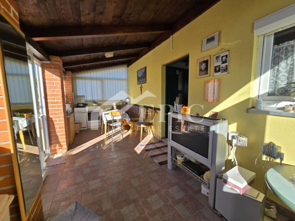 The house is fully furnished and equipped with everything necessary for permanent residence. The house itself consists of a large glazed terrace (functioning as a kitchen and dining area), a living area, a bedroom on the mezzanine, a bathroom, and a storage room with an external entrance. The entire building has 5 cm thick external insulation, a newly installed air conditioning unit, and a satellite antenna.