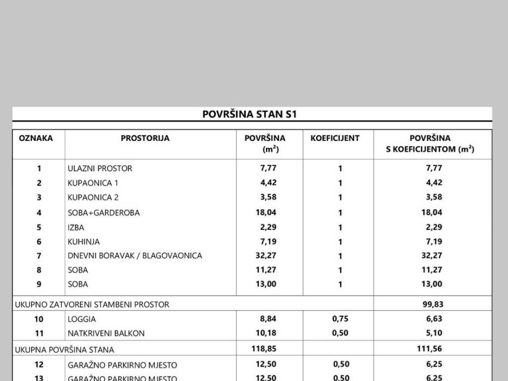 Apartment BS1 - ground floor (orientation: S and W) - living net area 99.83 (3 bedrooms + 2 bathrooms) + loggia (8.84 m2) + covered balcony (10.18 m2) + 2 garage parking spaces, total net accounting area 148,01 m2 = 666.045 EUR