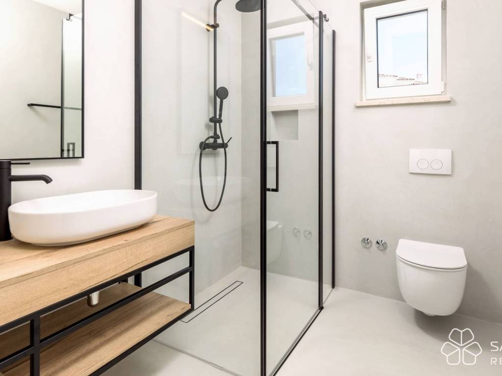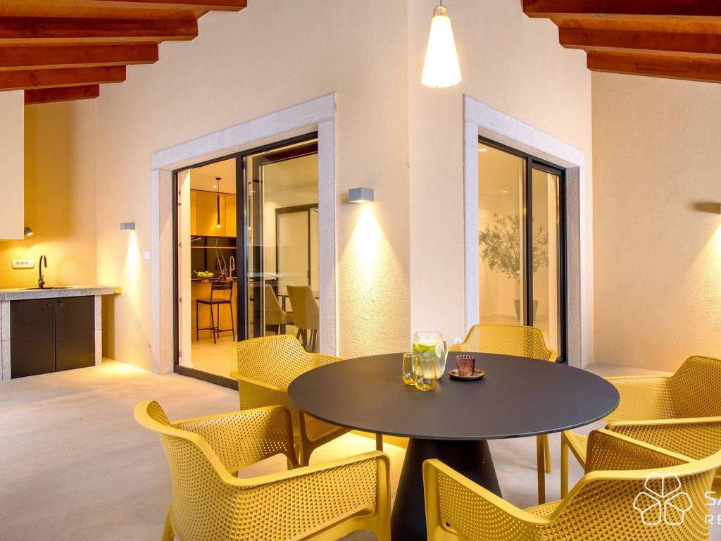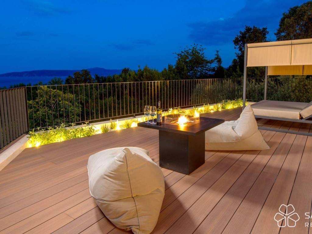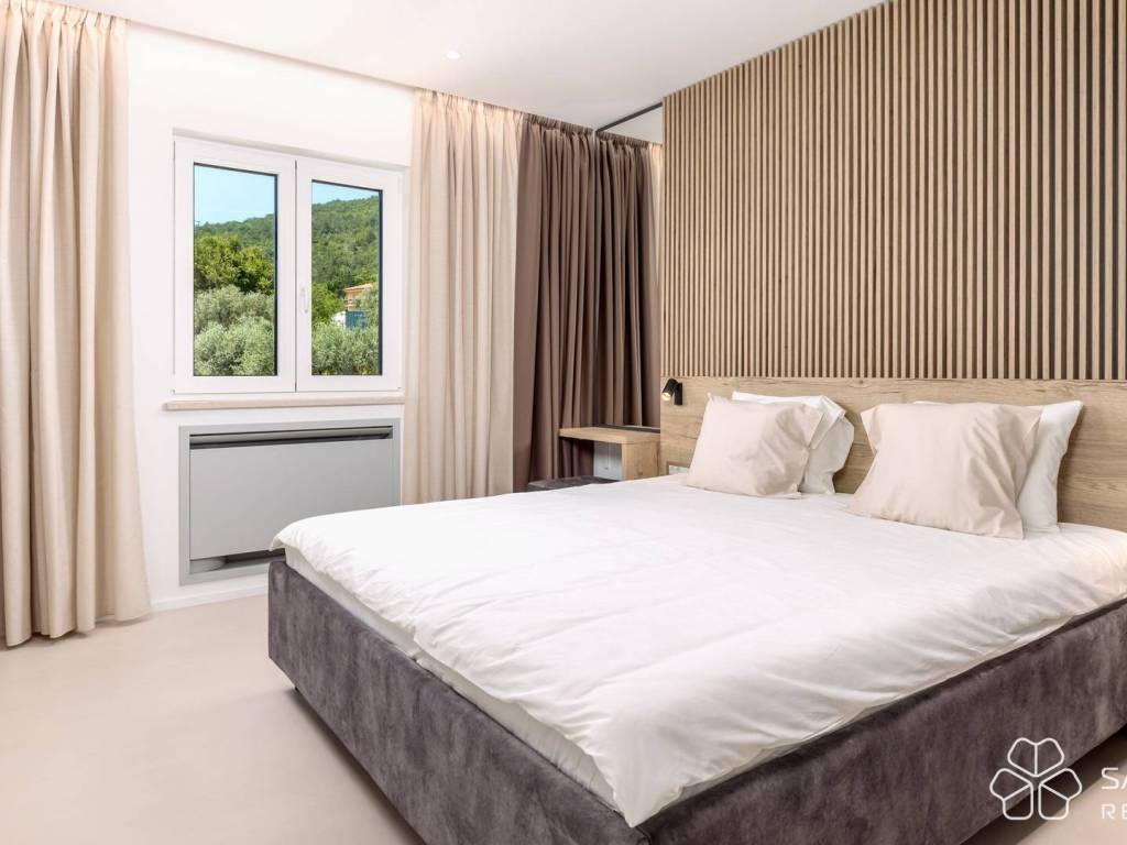 At a unique location in Mošćenička Draga, on an elevated cliff with open views of the sea and the island of Cres, a newly built luxury Mediterranean-style villa is for sale. Just a few minutes’ walk from the beach, the villa offers complete privacy and a peaceful environment, ideal for family living or holidays. The villa is located 11 kilometers from Opatija, approximately a 20-minute drive by car.