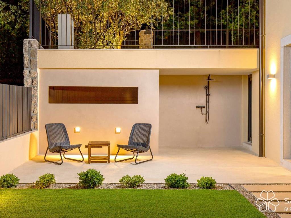 The landscaped garden, paved with stone and enriched with Mediterranean greenery, includes a swimming pool and jacuzzi, sun deck, outdoor kitchen with barbecue area, and a sauna with a sea view. The villa is equipped with a heat pump, fan coil system, alarm system, and video surveillance.