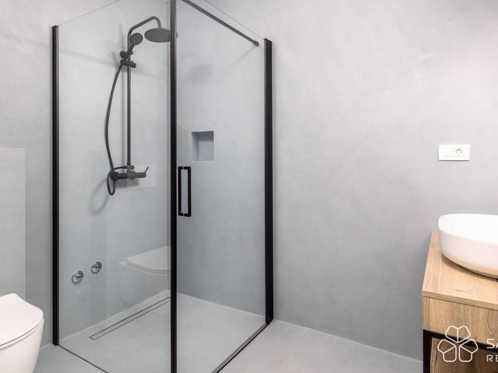 The villa is spread over two floors. The ground floor features a spacious open-plan living room with a kitchen and dining area connected to a large terrace, one bedroom with a bathroom, a wardrobe, and a guest toilet. The first floor comprises three bedrooms, each with its own bathroom and south-facing balconies offering panoramic sea views. The interior is fitted with handcrafted custom-made furniture, never used, with luxurious microcement finishes and underfloor heating in all rooms.
