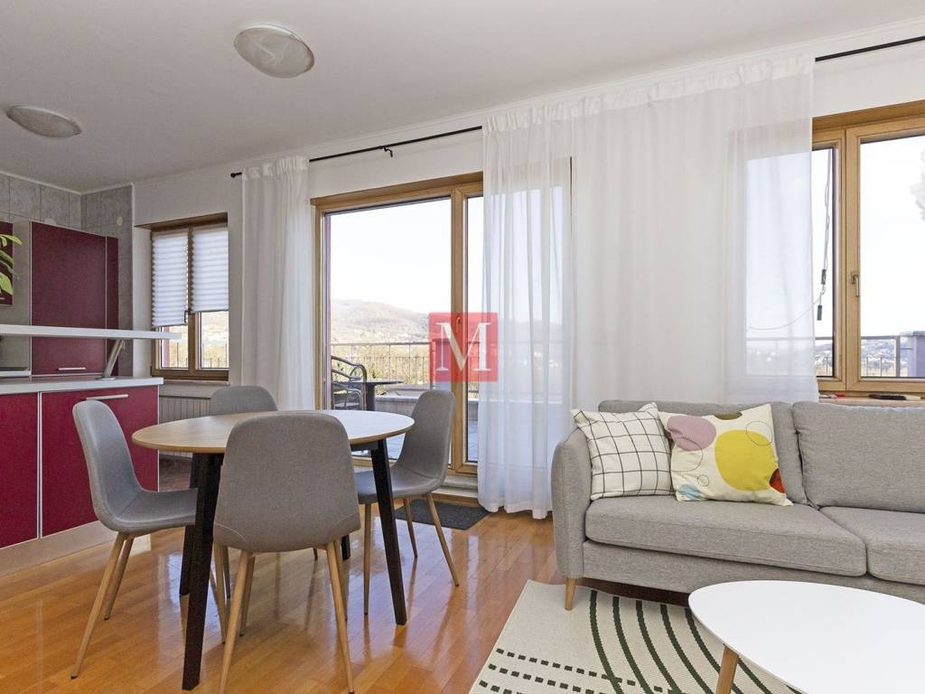 It consists of an entrance hall, an open space kitchen with a living room that leads to a large terrace with a panoramic view, 2 bedrooms, 1 bathroom and a guest toilet.