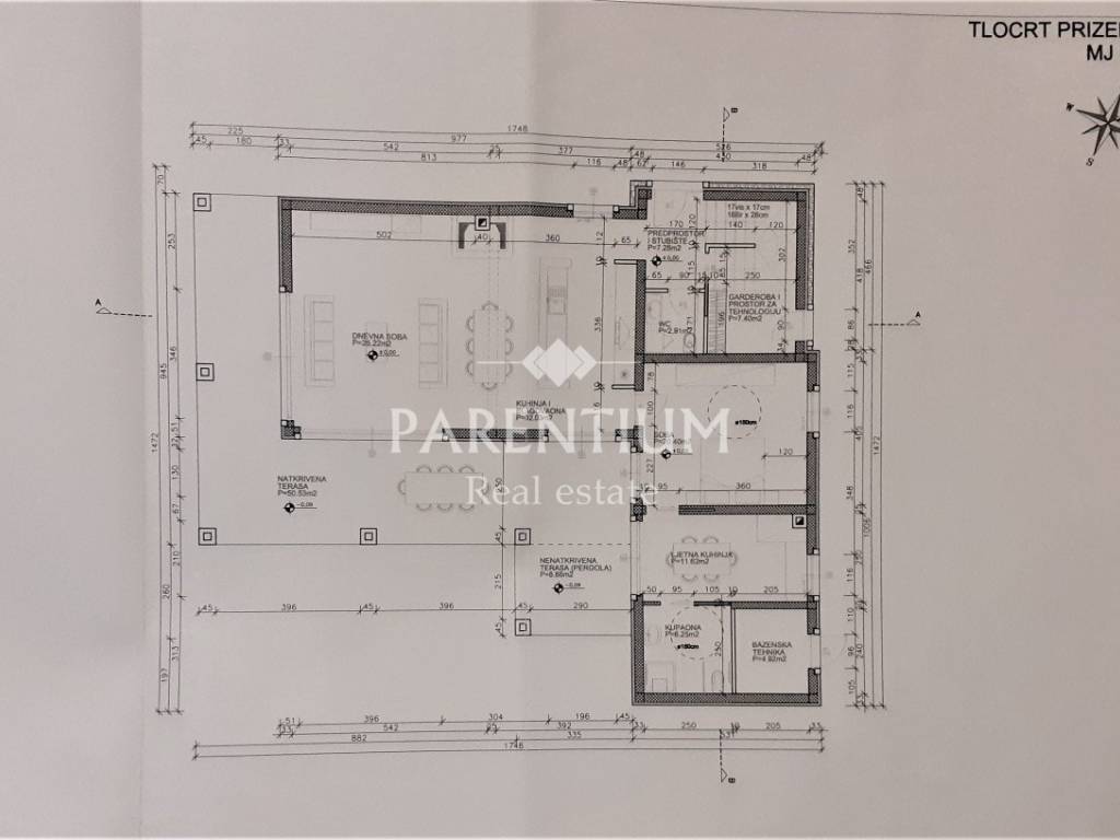 As can be seen from the floor plan, the ground floor will house a kitchen with dining area, living room with fireplace, one bedroom with wardrobe, bathroom and a small guest toilet. The villa will have a covered terrace with a summer kitchen, which will be combined with an overflow pool with a beautiful view of nature, hills and the sea.