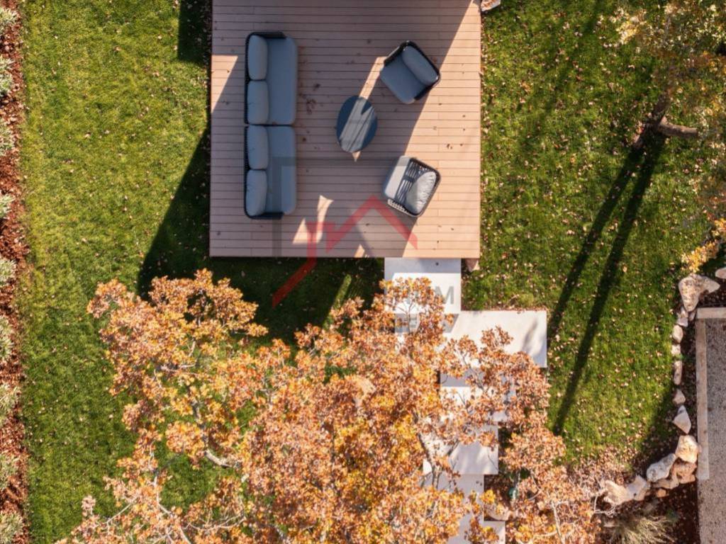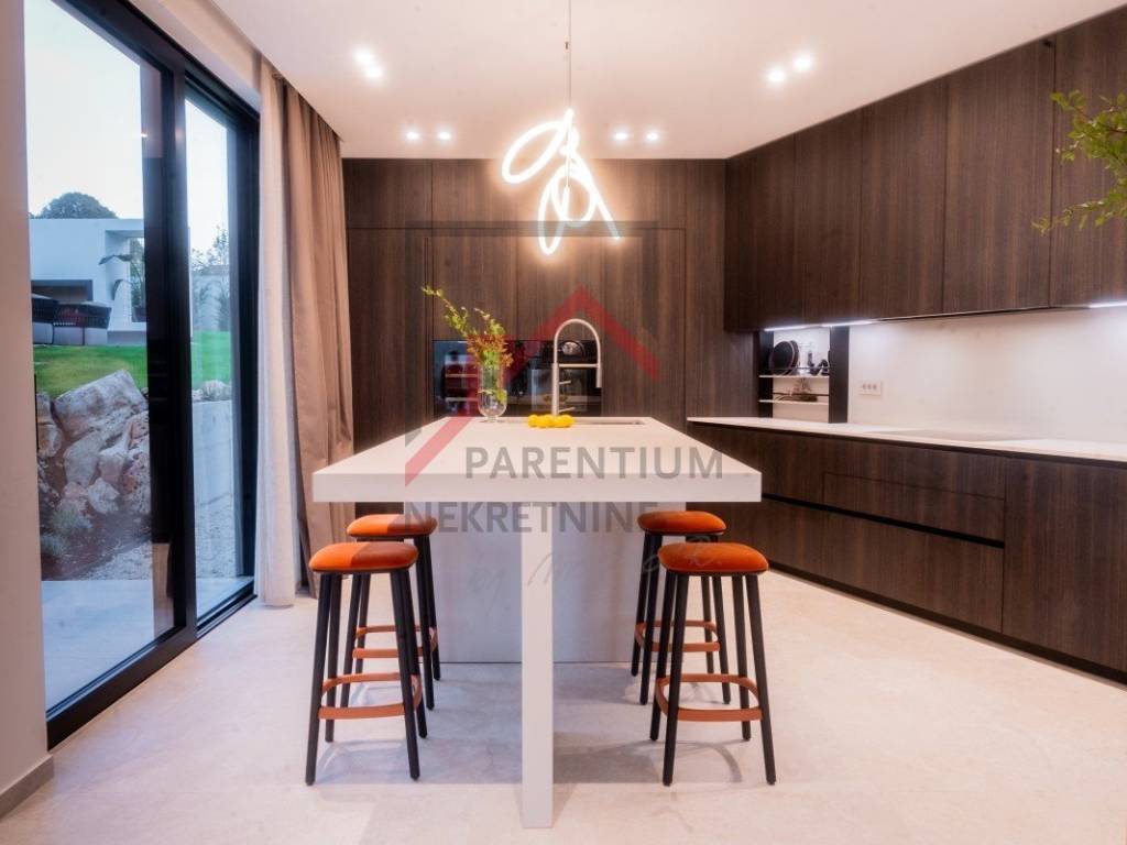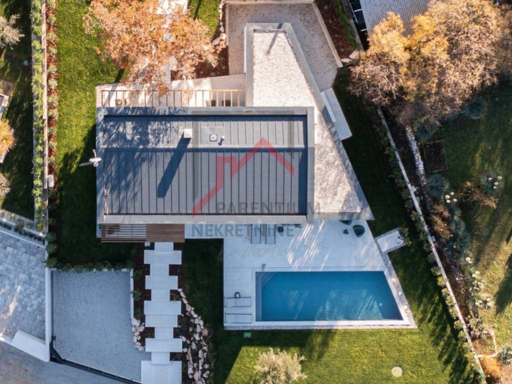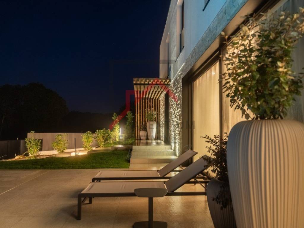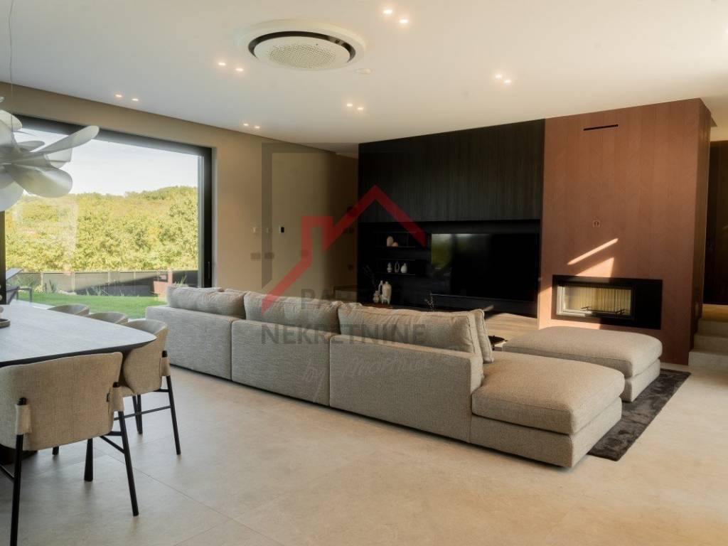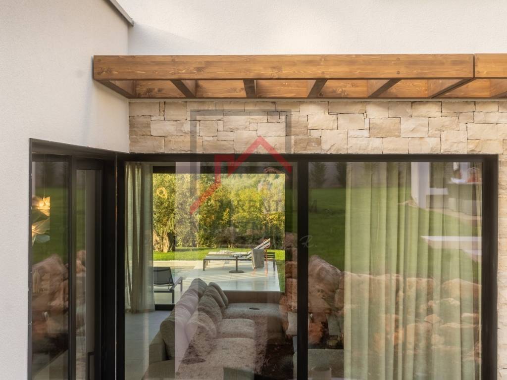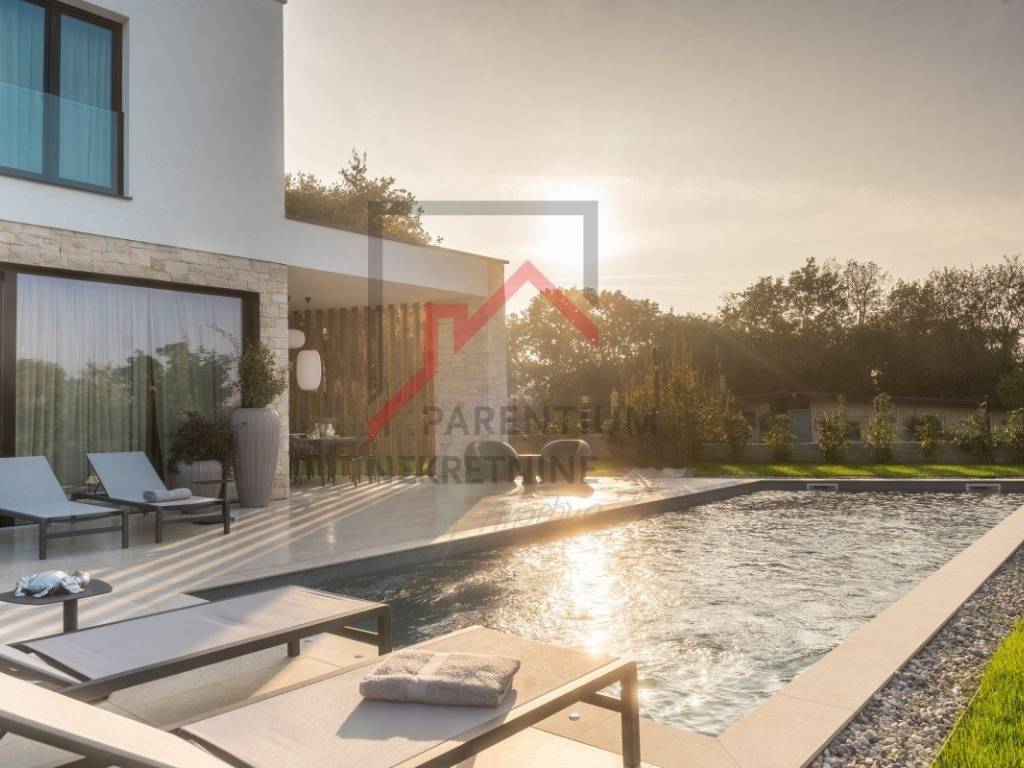 On the western coast of Istria, close to Poreč 14 km, Vrsar 10 km, and Rovinj 22 km, in greenery and away from city crowds, a perfect place for the rest of the spirit and body. A place you will never want to leave, a place for every serious hedonist.On a plot of 1000 m2, this is the last land in the building zone, offering an unobstructed view of orchards and olive groves that guarantee peace and intimacy, while the upper floor offers a view of the sea.The ground floor consists of a spacious utility room with washing machines and a boiler, a guest toilet, a fitness and sauna room or home office, a spacious living room, and kitchen. The stairs to the upper floor are lined with wood.The spacious living room is glazed on three sides with high lift-and-slide aluminum glass walls aligned with the floor without a threshold from the manufacturer 'Wicona'. In the ground floor, all curtains are motorized. The furniture and equipment used in the living room are from well-known Italian brands Novamobili, Copat cucine, DallAgnese, Slamp.