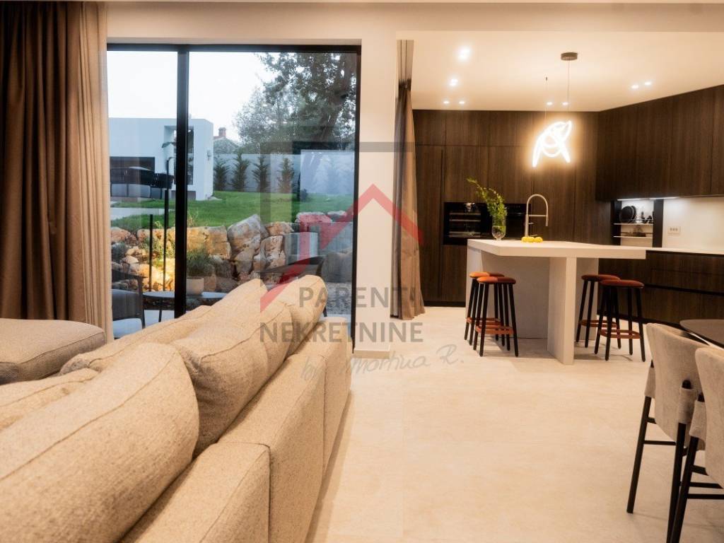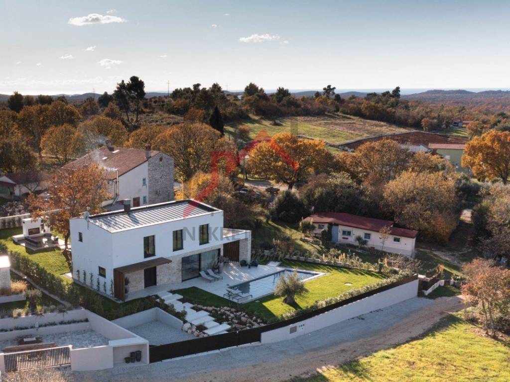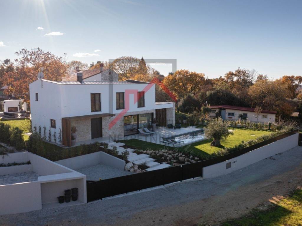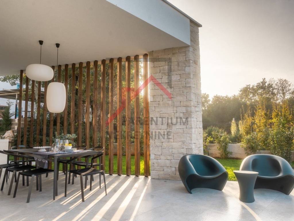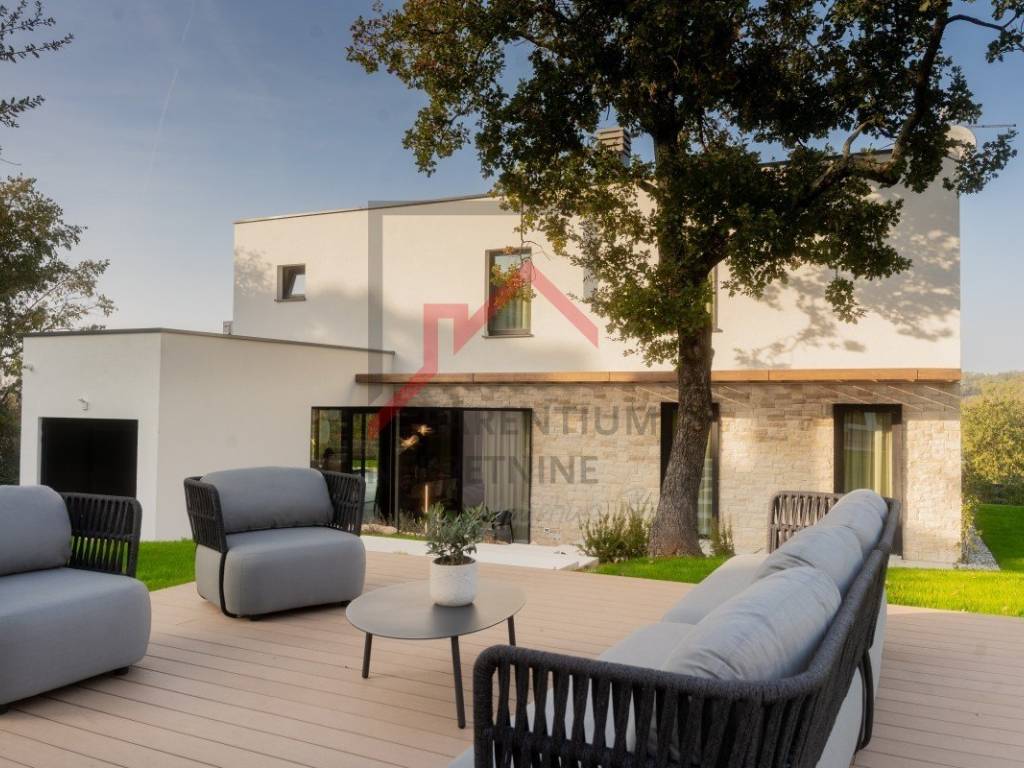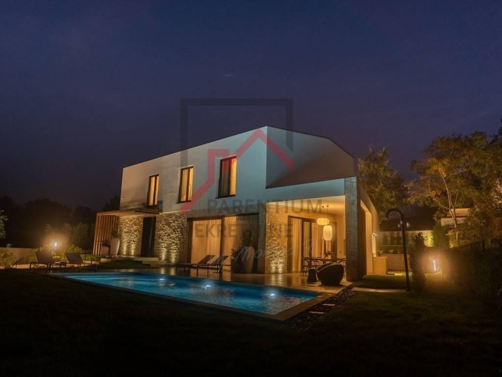 On the western coast of Istria, close to Poreč 14 km, Vrsar 10 km, and Rovinj 22 km, in greenery and away from city crowds, a perfect place for the rest of the spirit and body. A place you will never want to leave, a place for every serious hedonist.On a plot of 1000 m2, this is the last land in the building zone, offering an unobstructed view of orchards and olive groves that guarantee peace and intimacy, while the upper floor offers a view of the sea.The ground floor consists of a spacious utility room with washing machines and a boiler, a guest toilet, a fitness and sauna room or home office, a spacious living room, and kitchen. The stairs to the upper floor are lined with wood.The spacious living room is glazed on three sides with high lift-and-slide aluminum glass walls aligned with the floor without a threshold from the manufacturer 'Wicona'. In the ground floor, all curtains are motorized. The furniture and equipment used in the living room are from well-known Italian brands Novamobili, Copat cucine, DallAgnese, Slamp.