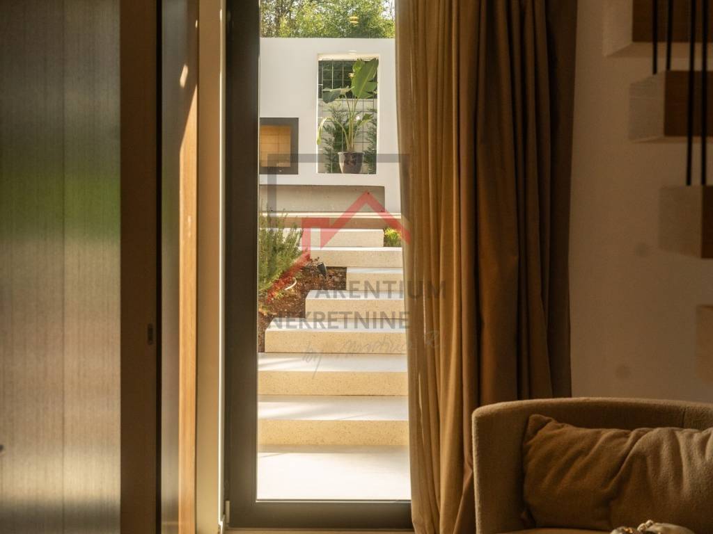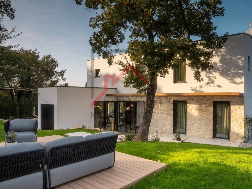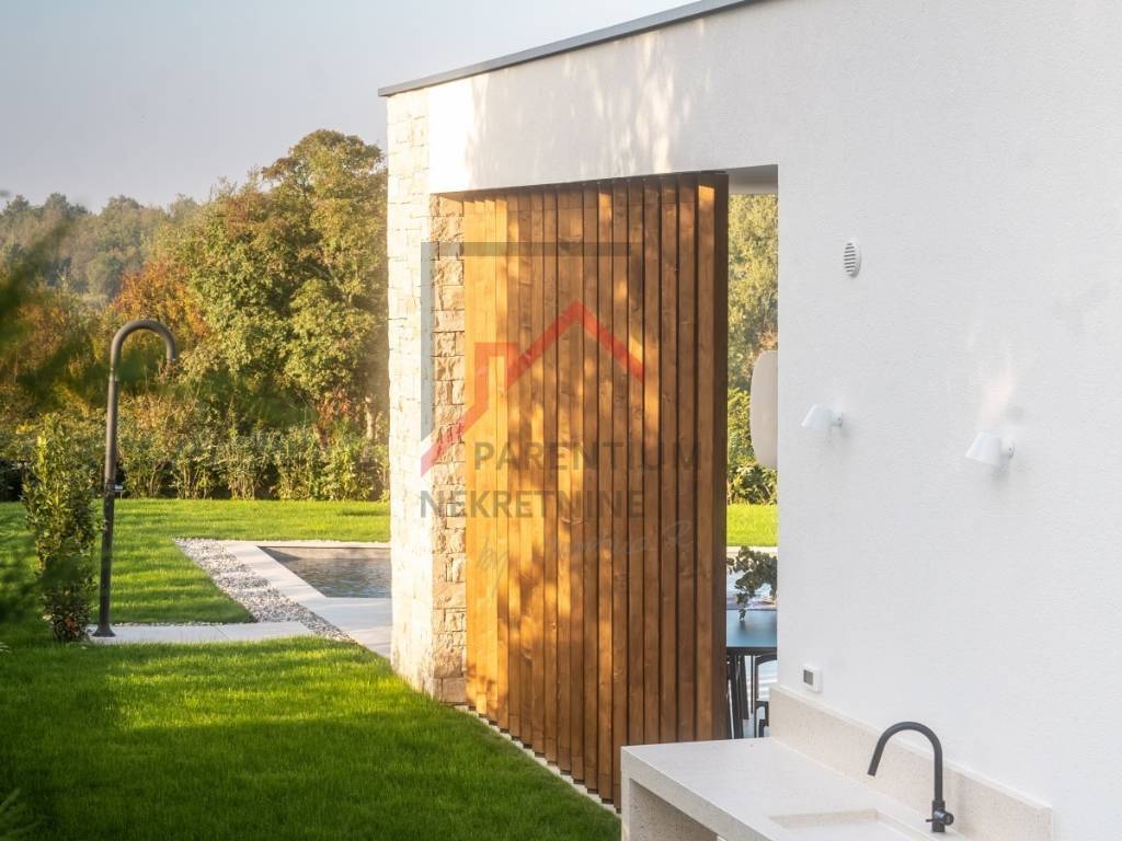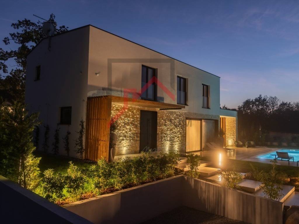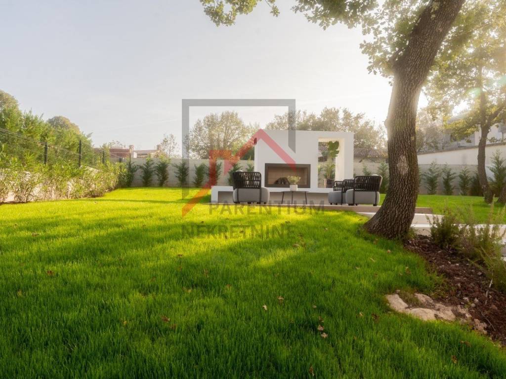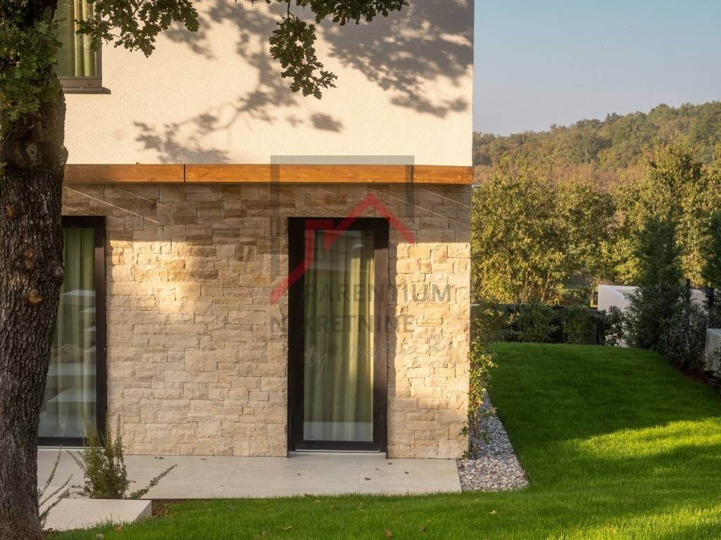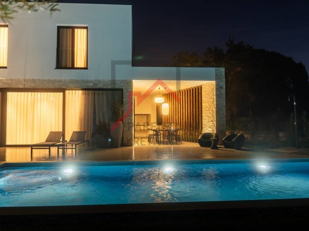 On the western coast of Istria, close to Poreč 14 km, Vrsar 10 km, and Rovinj 22 km, in greenery and away from city crowds, a perfect place for the rest of the spirit and body. A place you will never want to leave, a place for every serious hedonist.On a plot of 1000 m2, this is the last land in the building zone, offering an unobstructed view of orchards and olive groves that guarantee peace and intimacy, while the upper floor offers a view of the sea.The ground floor consists of a spacious utility room with washing machines and a boiler, a guest toilet, a fitness and sauna room or home office, a spacious living room, and kitchen. The stairs to the upper floor are lined with wood.The spacious living room is glazed on three sides with high lift-and-slide aluminum glass walls aligned with the floor without a threshold from the manufacturer 'Wicona'. In the ground floor, all curtains are motorized. The furniture and equipment used in the living room are from well-known Italian brands Novamobili, Copat cucine, DallAgnese, Slamp.