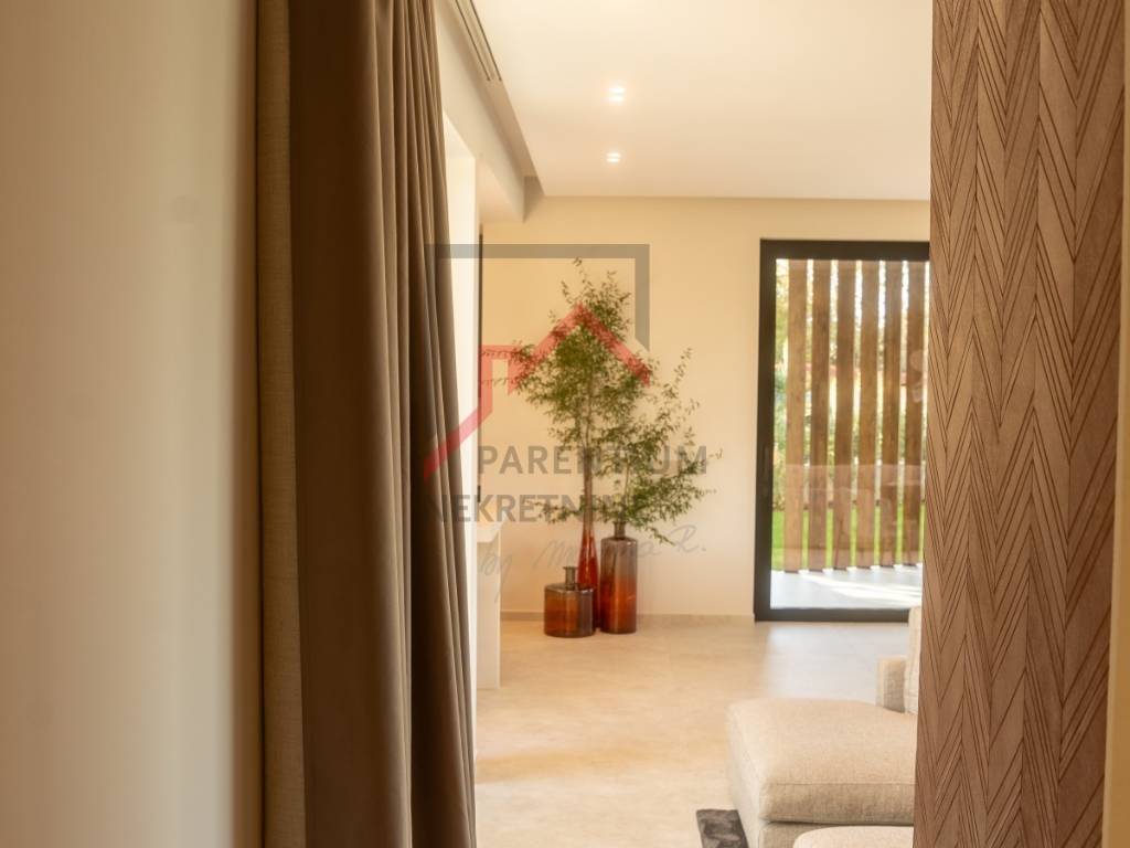 Spacious kitchen with an island by the brand Copat life and countertops made of quartz stone from the renowned brand 'Sileston', equipped with top-notch built-in appliances Miele, Liebherr, Faber, etc., refrigerator, freezer with ice maker, wine cooler.The floor consists of 3 spacious bedrooms, each with its own bathroom.The bedrooms and hallway are laid with wide-format parquet. All bedrooms are air-conditioned with Samsung windfree units and heated via built-in underfloor heating and thermostats that can be controlled via Wi-Fi. Each room features a French window from a manufacturer with integrated Guardian Sun glass (reducing heat intake and improving thermal insulation) and a mosquito net. The furniture and equipment for the bedrooms are from renowned brands Novamobili, DallAgnese, Quinti, Rotaliana.Next to the living room, there is a covered terrace of 22 m2 with a gas grill from the brand 'Fogher', alongside which is an additional spacious sink with a supplementary worktop. The furniture for the garden sets is from well-known Italian brands.