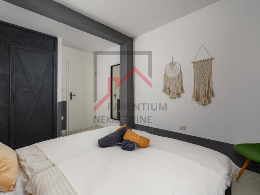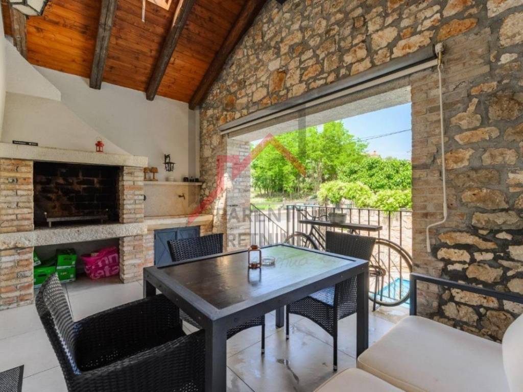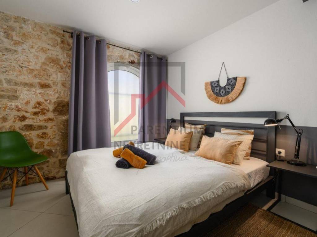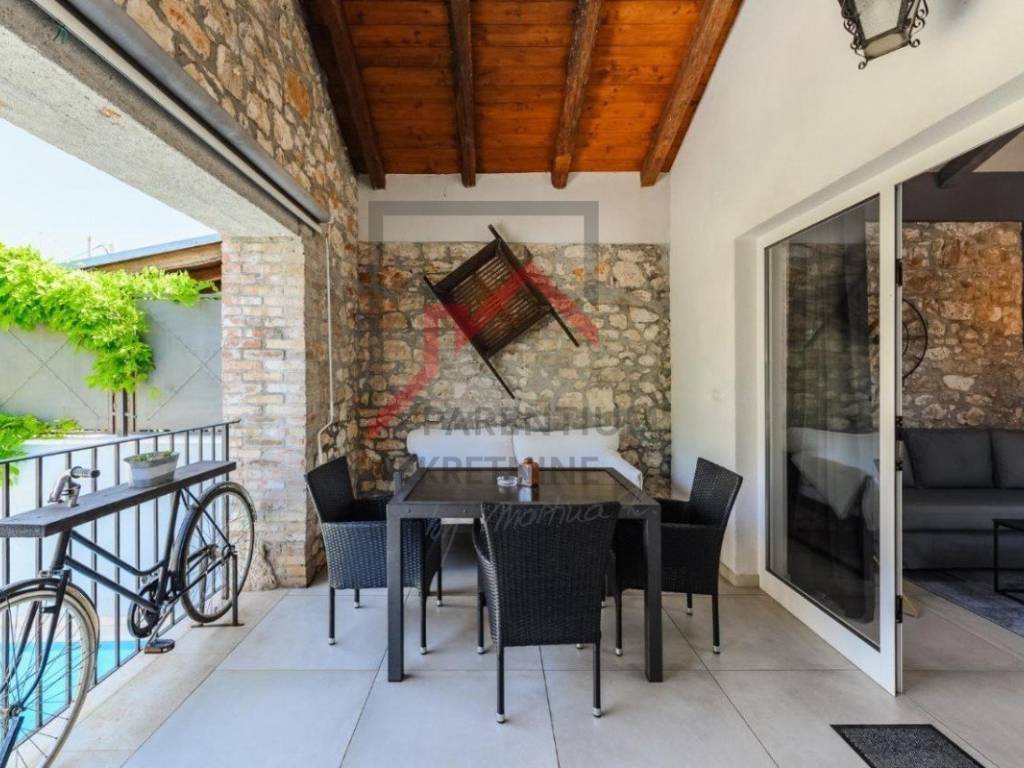The ground floor offers a cozy and spacious living room that connects to an elegantly decorated kitchen and dining room, while a modern bathroom completes the functionality of the space. A large covered terrace with a fireplace creates an ideal ambiance for relaxing and enjoying the outdoors, and below is a spacious courtyard with a private pool - perfect for summer refreshments.