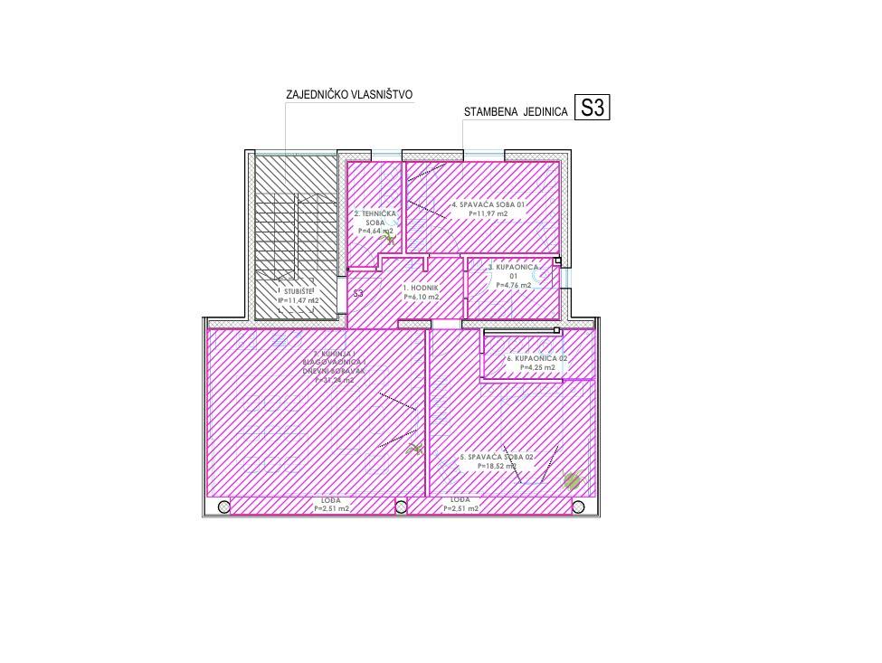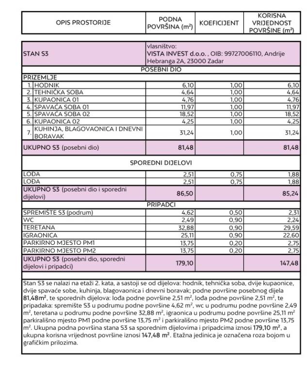 Diklo, dvosoban penthouse s teretanom i spremištem, te predivnim pogledom!! Predmetna stambena građevina sastoji se od tri stambene jedinice. U prizemlju se nalazi stan 1, na 1. katu se nalazi stan 2, a na 2. katu se nalazi stan 3 dok su u podrumu smještena spremišta i dodatni sadržaji. Stan S3 se nalazi na cijeloj etaži 2. kata, a sastoji se od dijelova: hodnik, tehnička soba, dvije spavaće sobe, dvije kupaonice, kuhinja, blagovaonica i dnevni boravak, sporednih dijelovate dvije lođe, ukupno 85,24 m2. Dodatno mu u suterenu pripadaju spremište, wc, teretana i igraonica , te dva parkirališna mjesta. Ukupno će etažna jedinica stana oznake S3 imati 147,48 m2. Ugrađivat će se: - najkvalitetnija aluminijska stolarija na tržištu - harmo aluminijska sjenila (mogućnost potpune zaštite od sunca) - podno grijanje na principu dizalice topline u svim prostorijama - kondicioniranje zraka uz pomoć dizalice topline (grijanje i hlađenje, multi split sustav) -vrhunska talijanska keramika - sanitarije renomiranih svjetskih proizvođača - videoparlafon - sobna vrata sa skrivenim okovima - protuprovalna ulazna vrata. Završna obrada interijera uključuje vrhunske materijale; talijansku keramiku, višeslojni hrastov parket, alu stolariju, sanitarije renomiranih proizvođača kao što su Laufen i Hansgrohe, te dizajnerska unutarnja vrata. Ova nekretnina pruža idealan dom za obitelj no i mogućnost korištenja za nekretninu za odmor ili iznajmljivanja u turizmu. Investitor je firma te kupac ne plaća porez na promet nekretnina. Predviđeno useljenje i završetak je do kraja 2026. godine. Više informacija na upit.