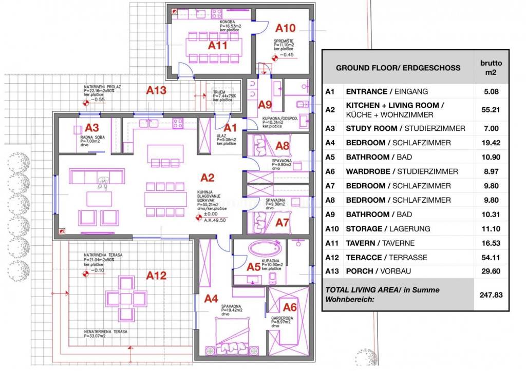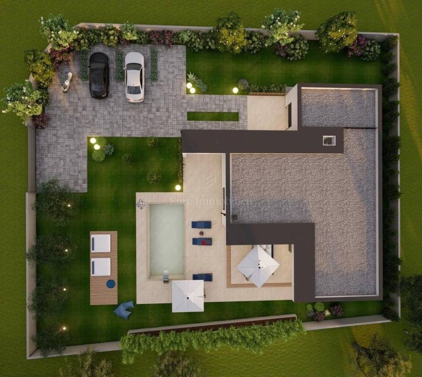 The house extends through only one floor. It consists of a garage, a storage room, two bathrooms, three bedrooms, a study and one open-concept room that combines a kitchen with a dining room and a spacious living room that opens onto a large terrace with a swimming pool.