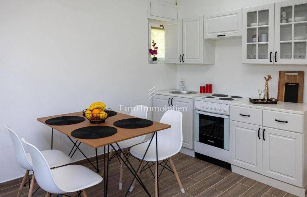 In a detached house for sale is the basement and the ground floor. The basement consists of a kitchen with a dining area, a bathroom and a bedroom. The ground floor has three rooms, a bathroom, and a kitchen with a dining area. The property also includes one parking space and access to a shared garden. It is located in a quiet neighbourhood near the centre, the beach and all necessary amenities for living or renting.