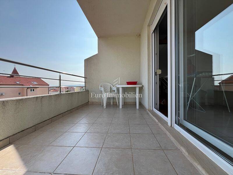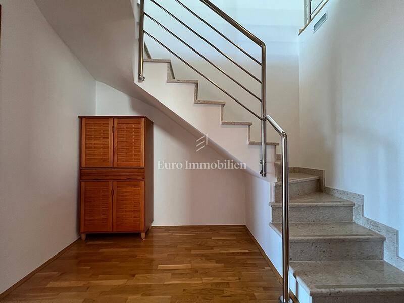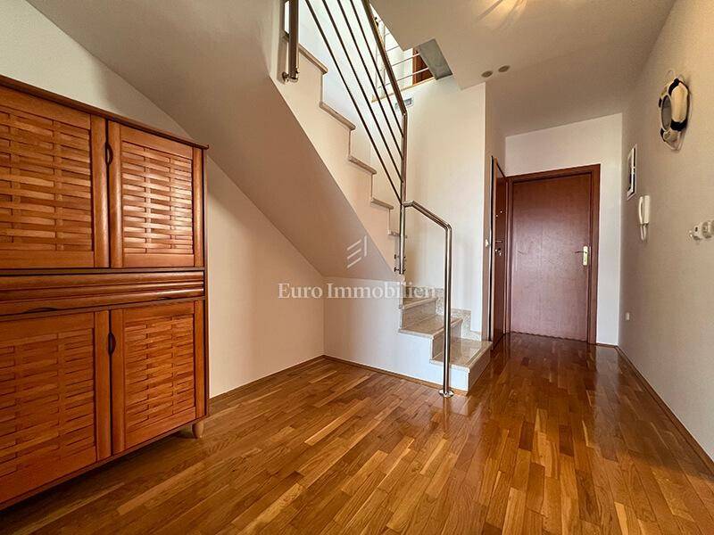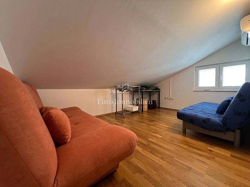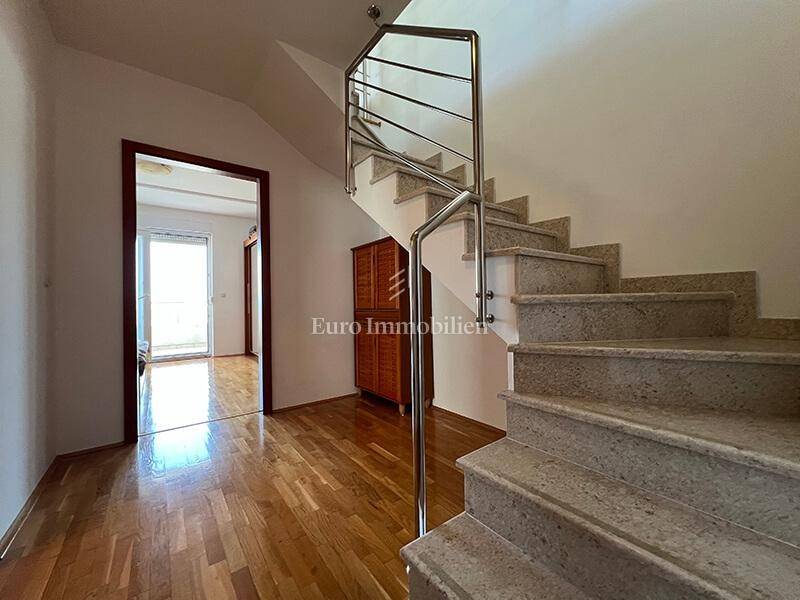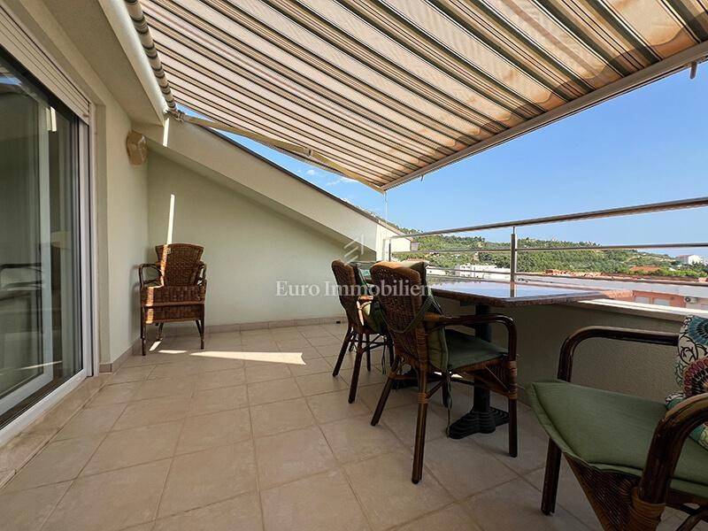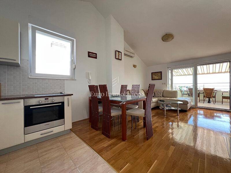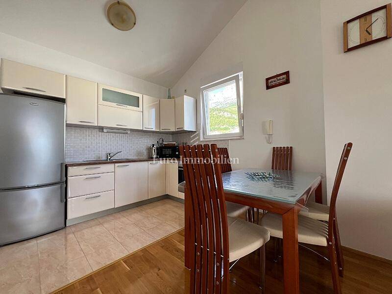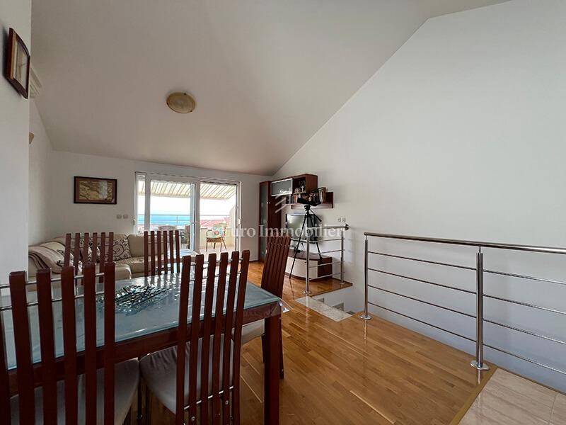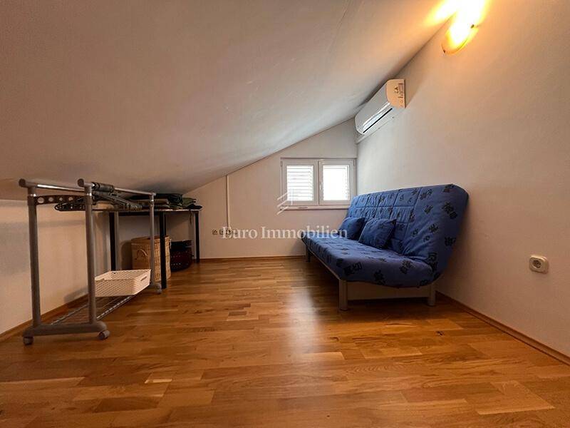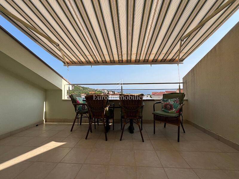 It consists of a hallway, two bedrooms, a bathroom and a loggia on the first floor and a kitchen, dining room, living room, bathroom, bedroom and a spacious roof terrace with an awning on the gallery. The apartment is south-facing with a beautiful view of the sea and islands.