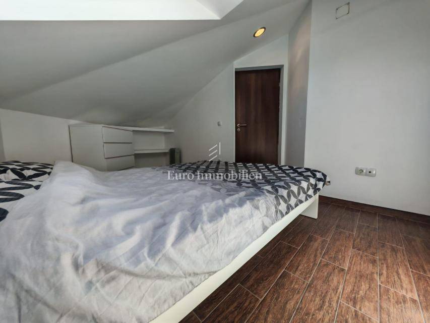 The apartment consists of a bathroom, two bedrooms, a spacious living room connected to the kitchen and dining room. The floor plan of the apartment is 70m2, but due to the slope, 50m2 is registered.