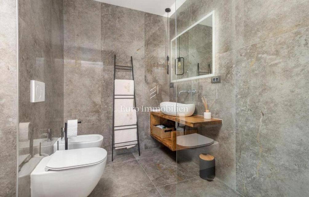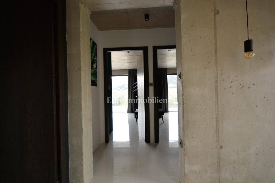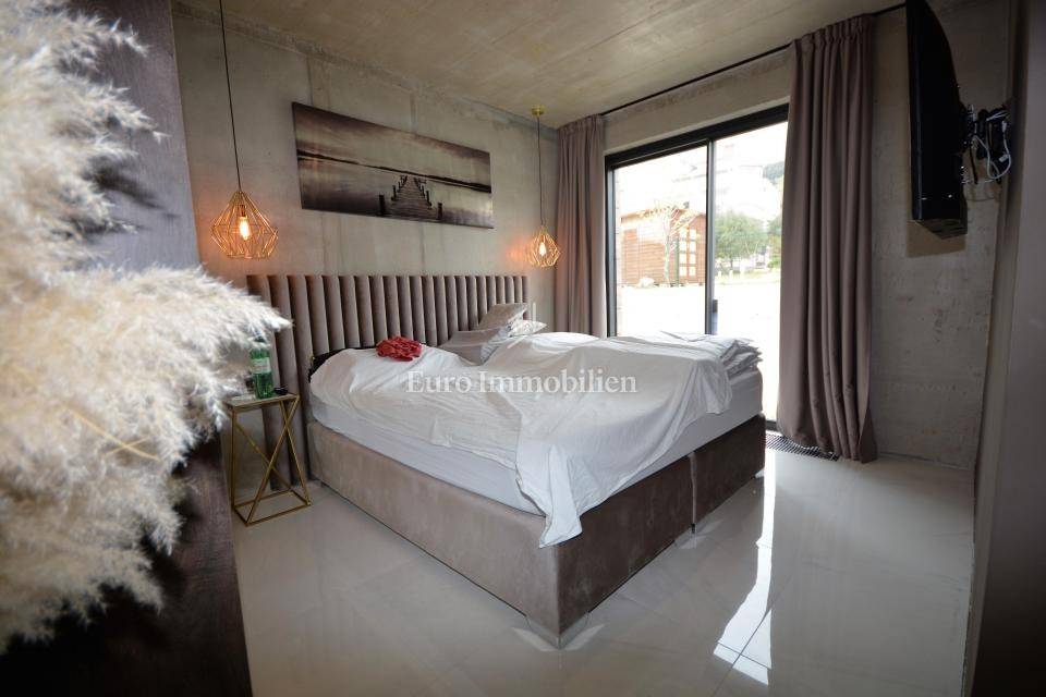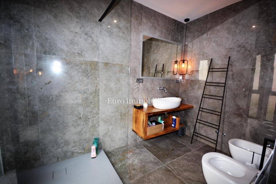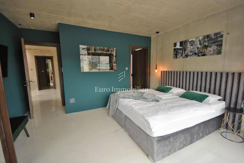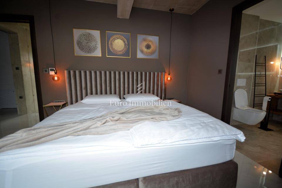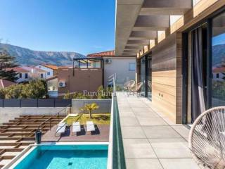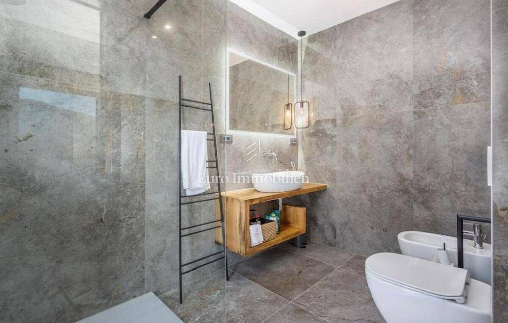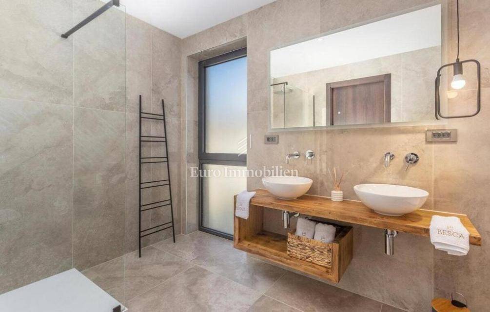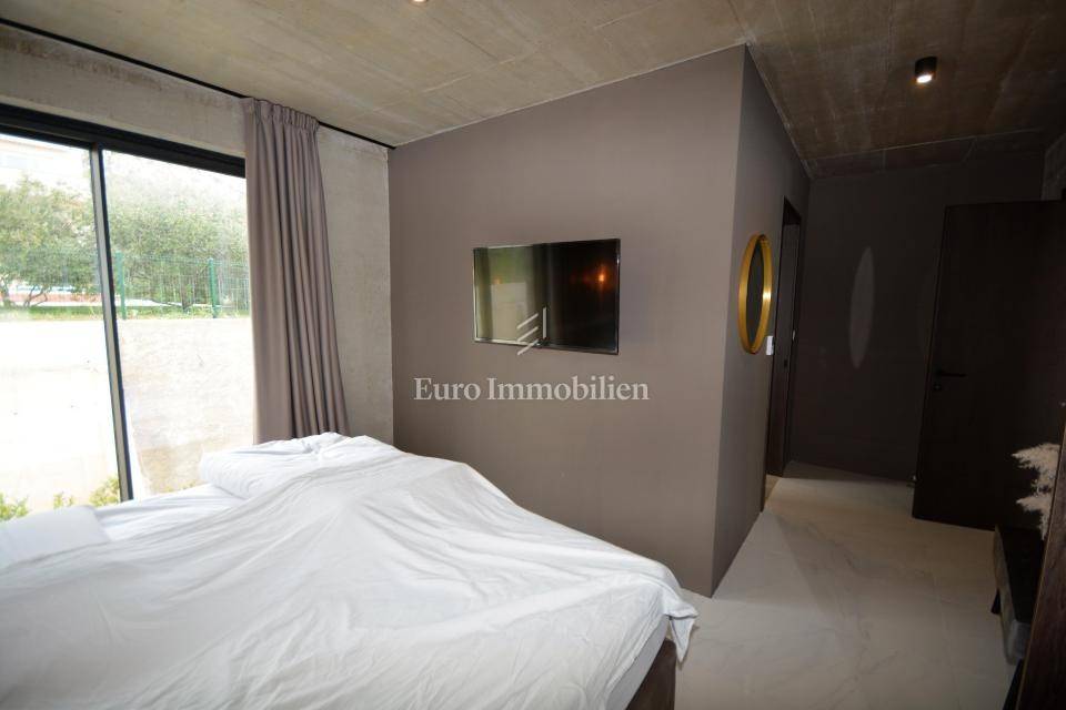 The villa is decorated with top-quality materials and equipment. On the roof there is a solar system with protection against overheating, the highest quality ceramics and sanitary ware were used, and most of the furniture and details are custom made. The heated pool has a built-in water purification system and automatic filter cleaning. The horticulture is beautifully designed; palm trees, Bonzai olives, and cedar are planted, and the whole garden has an automatic irrigation system. All rooms are equipped with a TV with antenna, satellite, and IPTV connection. The house has four outdoor covered parking spaces. On the roof, where the solar panels are, there is the possibility of making a roof terrace overlooking the sea.