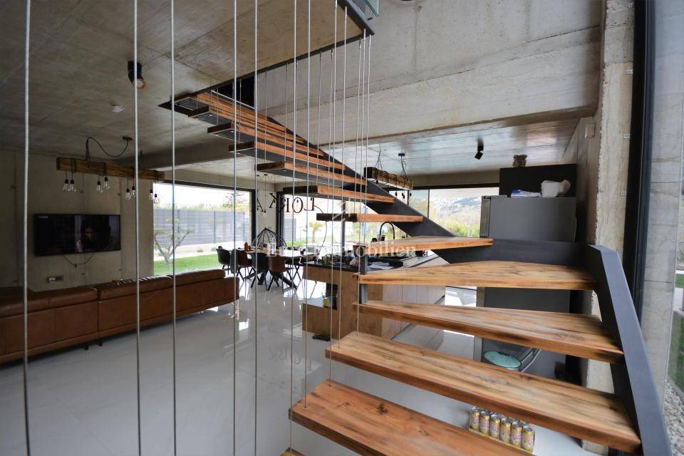 A wooden internal staircase leads to the ground floor where there is a toilet, open space living room, and kitchen with a dining area which leads to a spacious terrace with a large pool. The ground floor has plenty of daylight. The landscaped garden has an area of ​​672m2 and on it, next to the pool, there is a sun deck and an outdoor area for socializing with friends and family with a barbecue and summer kitchen.